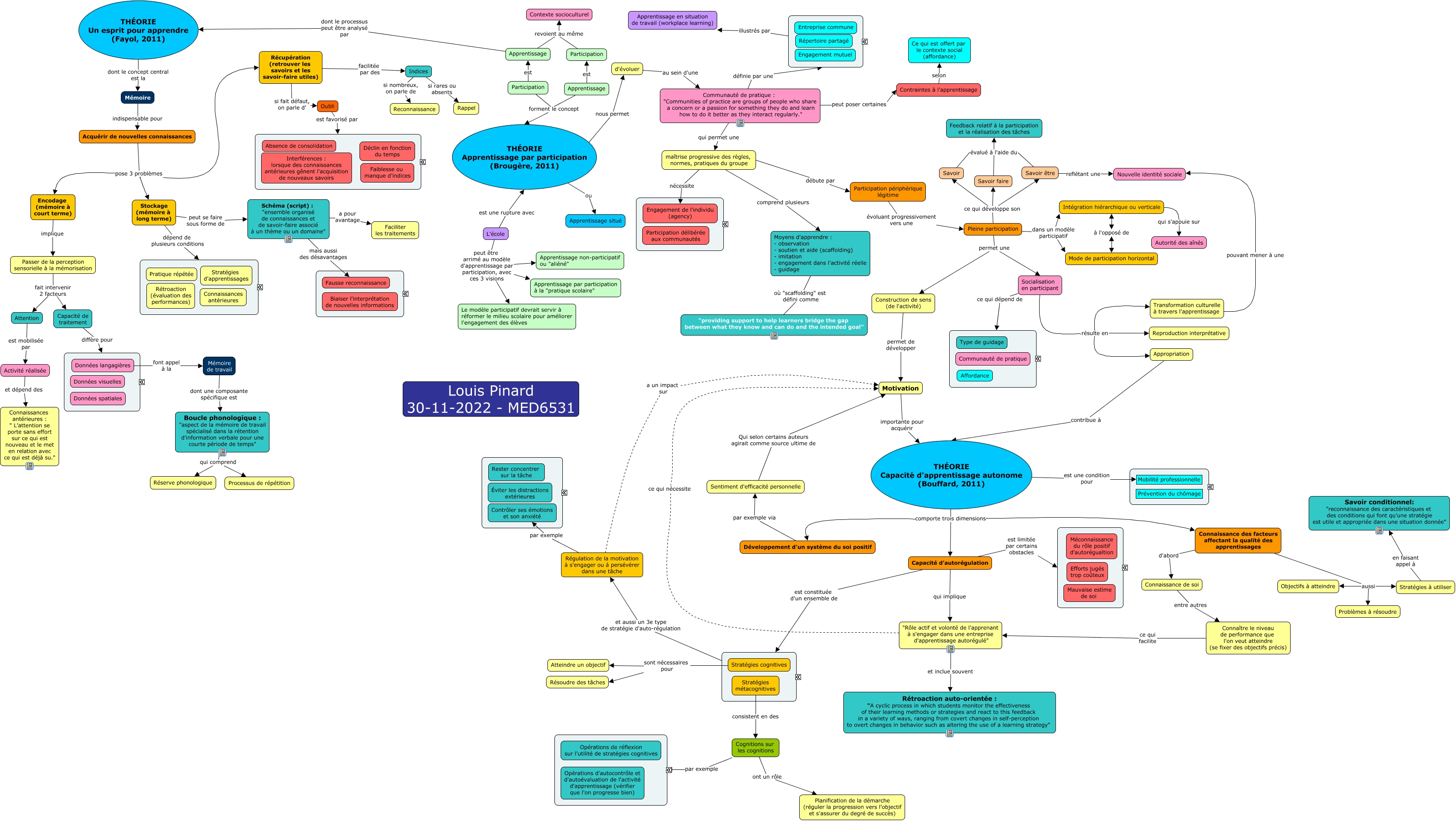 This Concept Map, created with IHMC CmapTools, has information related to: Theories_apprentissage-LPinard, Moyens d'apprendre : - observation - soutien et aide (scaffolding) - imitation - engagement dans l'activité réelle - guidage où "scaffolding" est défini comme "providing support to help learners bridge the gap between what they know and can do and the intended goal", Motivation importante pour acquérir THÉORIE Capacité d'apprentissage autonome (Bouffard, 2011), maîtrise progressive des règles, normes, pratiques du groupe nécessite Engagement de l'individu (agency), Capacité d'autorégulation est limitée par certains obstacles ????, maîtrise progressive des règles, normes, pratiques du groupe comprend plusieurs Moyens d'apprendre : - observation - soutien et aide (scaffolding) - imitation - engagement dans l'activité réelle - guidage, Boucle phonologique : "aspect de la mémoire de travail spécialisé dans la rétention d'information verbale pour une courte période de temps" qui comprend Processus de répétition, Indices si nombreux, on parle de Reconnaissance, THÉORIE Un esprit pour apprendre (Fayol, 2011) dont le concept central est la Mémoire, THÉORIE Capacité d'apprentissage autonome (Bouffard, 2011) comporte trois dimensions Connaissance des facteurs affectant la qualité des apprentissages, Intégration hiérarchique ou verticale à l'opposé de Mode de participation horizontal, Participation revoient au même Contexte socioculturel, Cognitions sur les cognitions par exemple ????, Communauté de pratique : "Communities of practice are groups of people who share a concern or a passion for something they do and learn how to do it better as they interact regularly." peut poser certaines Contraintes à l'apprentissage, Apprentissage revoient au même Contexte socioculturel, L'école peut être arrimé au modèle d'apprentissage par participation, avec ces 3 visions Le modèle participatif devrait servir à réformer le milieu scolaire pour améliorer l'engagement des élèves, Indices si rares ou absents Rappel, Contraintes à l'apprentissage selon Ce qui est offert par le contexte social (affordance), maîtrise progressive des règles, normes, pratiques du groupe débute par Participation périphérique légitime, Passer de la perception sensorielle à la mémorisation fait intervenir 2 facteurs Capacité de traitement, Socialisation en participant résulte en Transformation culturelle à travers l'apprentissage