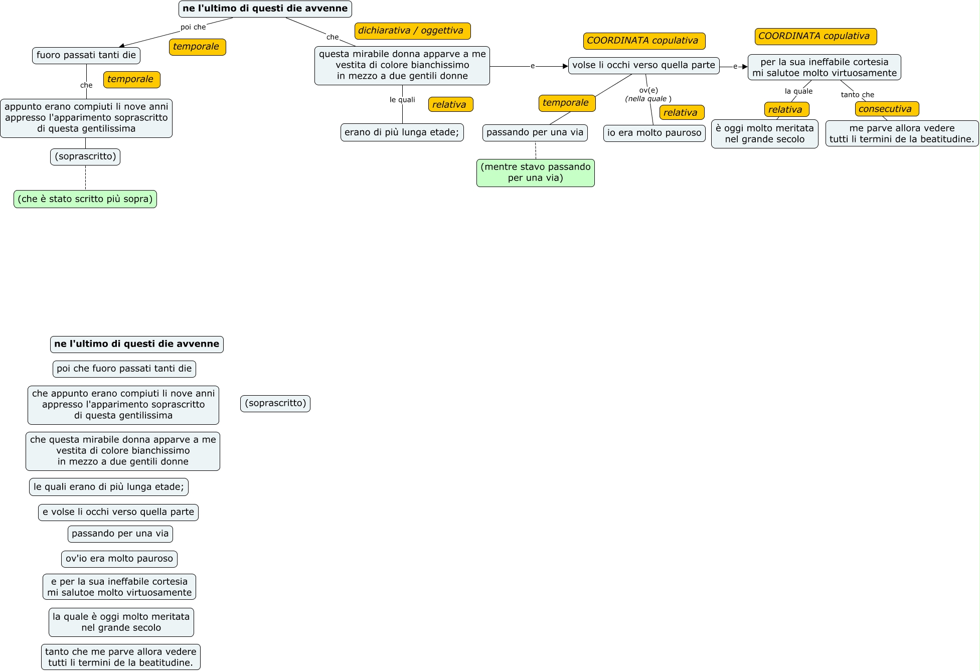 Questa Cmap, creata con IHMC CmapTools, contiene informazioni relative a: VITA NOVA_secondo incontro_ALBERO SINTATTICO, passando per una via ???? (mentre stavo passando per una via), volse li occhi verso quella parte e per la sua ineffabile cortesia mi salutoe molto virtuosamente, per la sua ineffabile cortesia mi salutoe molto virtuosamente la quale è oggi molto meritata nel grande secolo, volse li occhi verso quella parte ov(e) (nella quale) io era molto pauroso, volse li occhi verso quella parte ???? passando per una via, ne l'ultimo di questi die avvenne poi che fuoro passati tanti die, (soprascritto) ???? (che è stato scritto più sopra), appunto erano compiuti li nove anni appresso l'apparimento soprascritto di questa gentilissima ???? (soprascritto), per la sua ineffabile cortesia mi salutoe molto virtuosamente tanto che me parve allora vedere tutti li termini de la beatitudine., fuoro passati tanti die che appunto erano compiuti li nove anni appresso l'apparimento soprascritto di questa gentilissima, ne l'ultimo di questi die avvenne che questa mirabile donna apparve a me vestita di colore bianchissimo in mezzo a due gentili donne, questa mirabile donna apparve a me vestita di colore bianchissimo in mezzo a due gentili donne le quali erano di più lunga etade;, questa mirabile donna apparve a me vestita di colore bianchissimo in mezzo a due gentili donne e volse li occhi verso quella parte