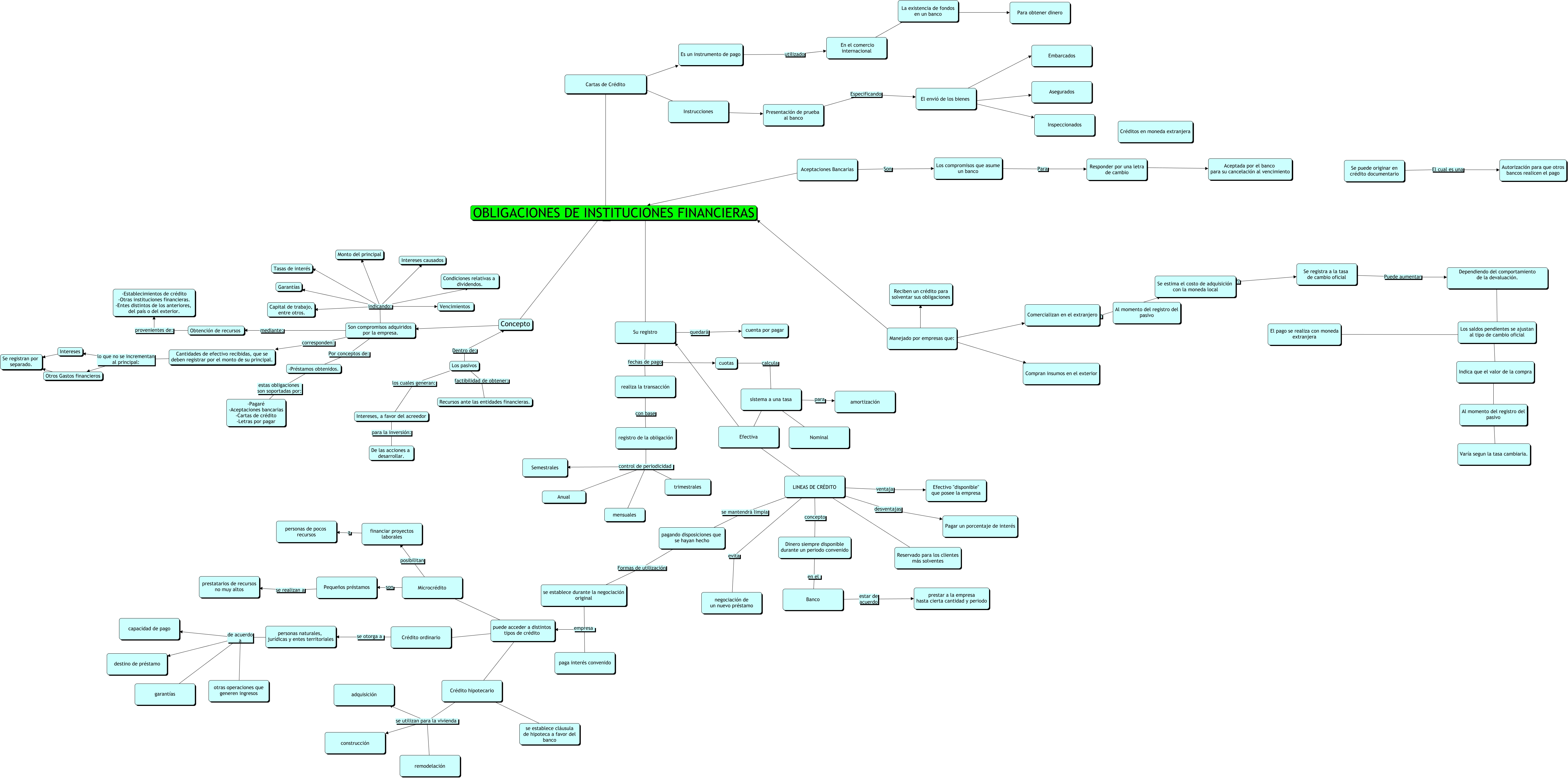 Este Cmap, tiene información relacionada con: CONTA - INSTITUCIONES, Dependiendo del comportamiento de la devaluación. ???? Los saldos pendientes se ajustan al tipo de cambio oficial, Presentación de prueba al banco Especificando El envió de los bienes, Manejado por empresas que: ???? OBLIGACIONES DE INSTITUCIONES FINANCIERAS, La existencia de fondos en un banco ???? Para obtener dinero, Cantidades de efectivo recibidas, que se deben registrar por el monto de su principal. lo que no se incrementan al principal: Otros Gastos financieros, En el comercio internacional Notifica La existencia de fondos en un banco, Cartas de Crédito ???? OBLIGACIONES DE INSTITUCIONES FINANCIERAS, financiar proyectos laborales a personas de pocos recursos, Concepto ???? Son compromisos adquiridos por la empresa., puede acceder a distintos tipos de crédito ???? Crédito hipotecario, Dinero siempre disponible durante un periodo convenido en el Banco, personas naturales, jurídicas y entes territoriales de acuerdo a destino de préstamo, pagando disposiciones que se hayan hecho Formas de utilización se establece durante la negociación original, Responder por una letra de cambio ???? Aceptada por el banco para su cancelación al vencimiento, Son compromisos adquiridos por la empresa. indicando: Vencimientos, Son compromisos adquiridos por la empresa. indicando: Garantías, Crédito hipotecario se utilizan para la vivienda construcción, Los compromisos que asume un banco Para Responder por una letra de cambio, Su registro fechas de pago realiza la transacción, Manejado por empresas que: ???? Reciben un crédito para solventar sus obligaciones