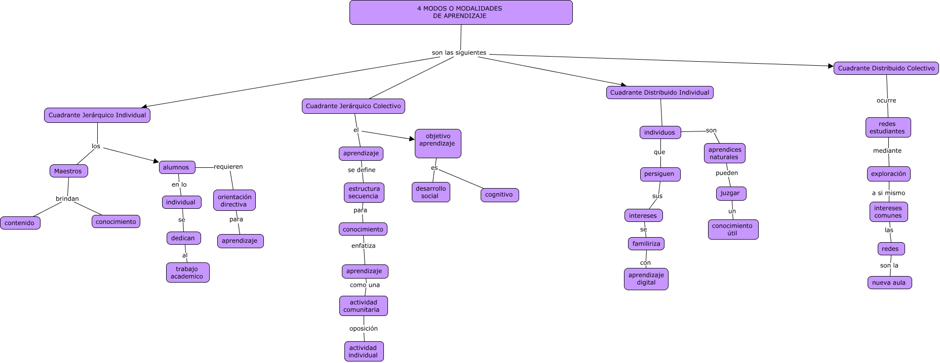 Este Cmap, tiene información relacionada con: modos de aprendizaje, aprendizaje se define estructura secuencia, Cuadrante Jerárquico Colectivo el aprendizaje, persiguen sus intereses, 4 MODOS O MODALIDADES DE APRENDIZAJE son las siguientes Cuadrante Jerárquico Individual, Cuadrante Jerárquico Individual los Maestros, juzgar un conocimiento útil, aprendices naturales pueden juzgar, redes estudiantes mediante exploración, exploración a si mismo intereses comunes, Cuadrante Distribuido Colectivo ocurre redes estudiantes, familiriza con aprendizaje digital, individuos son aprendices naturales, estructura secuencia para conocimiento, intereses comunes las redes, redes son la nueva aula, Maestros brindan contenido, Maestros brindan conocimiento, individual se dedican, 4 MODOS O MODALIDADES DE APRENDIZAJE son las siguientes Cuadrante Jerárquico Colectivo, objetivo aprendizaje es cognitivo