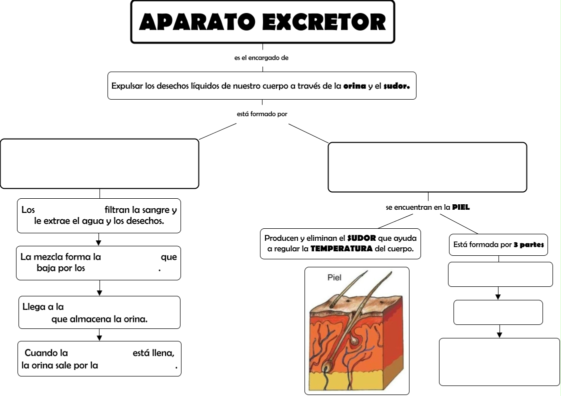 Este Cmap, tiene información relacionada con: APARATO EXCRETOR INCOMPLETO, EL SISTEMA URINAR IO ???? Los filtran la sangre y le extrae el agua y los desechos., La mezcla forma la que baja por los URÉTERES . 4º Llega a la V EJIGA URINARIA que almacena la orina., ????, EL SISTEMA URINAR IO se encuentran en la PIEL Está formada por 3 partes, Los filtran la sangre y le extrae el agua y los desechos. ???? La mezcla forma la que baja por los URÉTERES ., APARATO EXCRETOR es el encargado de Expulsar los desechos líquidos de nuestro cuerpo a través de la orina y el sudor., Expulsar los desechos líquidos de nuestro cuerpo a través de la orina y el sudor. está formado por EL SISTEMA URINAR IO, ????, Expulsar los desechos líquidos de nuestro cuerpo a través de la orina y el sudor. está formado por EL SISTEMA URINAR IO, Llega a la V EJIGA URINARIA que almacena la orina. ???? Cuando la está llena, la orina sale por la A., Está formada por 3 partes ????, EL SISTEMA URINAR IO se encuentran en la PIEL Producen y eliminan el SUDOR que ayuda a regular la TEMPERATURA del cuerpo.