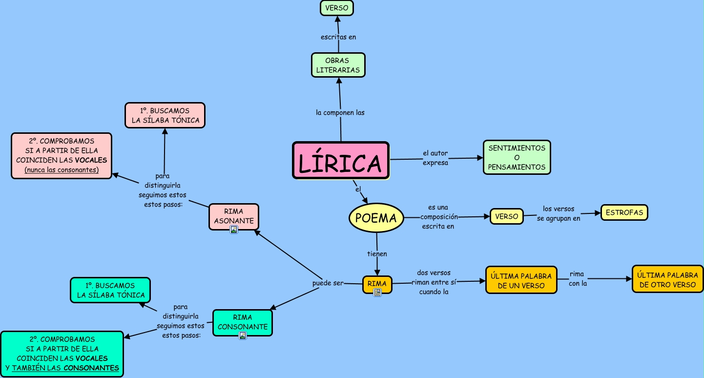 Este Cmap, tiene información relacionada con: L�?RICA, L�?RICA el POEMA, OBRAS LITERARIAS escritas en VERSO, RIMA ASONANTE para distinguirla seguimos estos estos pasos: 2º. COMPROBAMOS SI A PARTIR DE ELLA COINCIDEN LAS VOCALES (nunca las consonantes), RIMA ASONANTE para distinguirla seguimos estos estos pasos: 1º. BUSCAMOS LA S�?LABA TÓNICA, RIMA dos versos riman entre sí cuando la ÚLTIMA PALABRA DE UN VERSO, RIMA puede ser RIMA ASONANTE, RIMA CONSONANTE para distinguirla seguimos estos estos pasos: 2º. COMPROBAMOS SI A PARTIR DE ELLA COINCIDEN LAS VOCALES Y TAMBIÉN LAS CONSONANTES, L�?RICA el autor expresa SENTIMIENTOS O PENSAMIENTOS, POEMA es una composición escrita en VERSO, RIMA CONSONANTE para distinguirla seguimos estos estos pasos: 1º. BUSCAMOS LA S�?LABA TÓNICA, VERSO los versos se agrupan en ESTROFAS, RIMA puede ser RIMA CONSONANTE, POEMA tienen RIMA, L�?RICA la componen las OBRAS LITERARIAS, ÚLTIMA PALABRA DE UN VERSO rima con la ÚLTIMA PALABRA DE OTRO VERSO