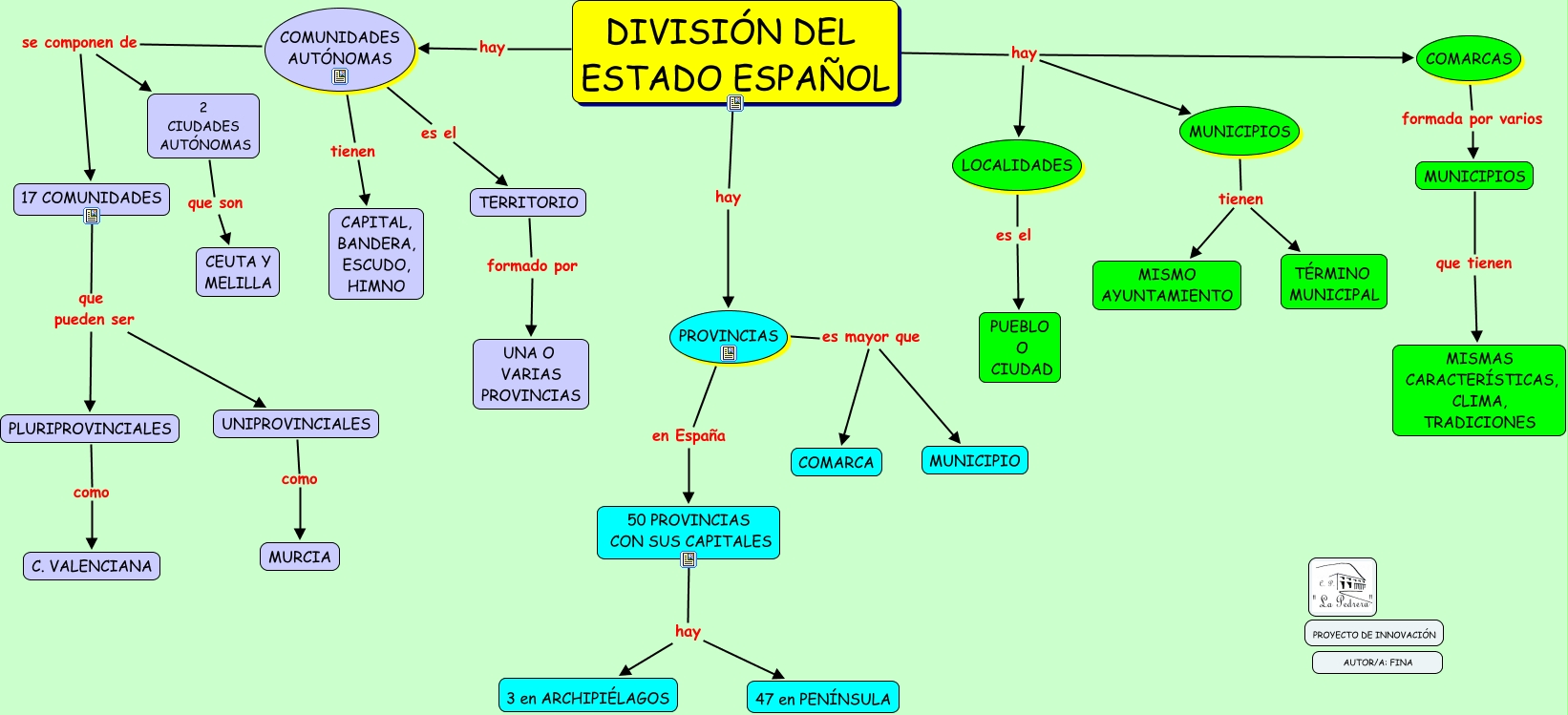 Este Cmap, tiene información relacionada con: DIVISIÓN DEL ESTADO ESPAÑOL, DIVISIÓN DEL ESTADO ESPAÑOL hay PROVINCIAS, COMUNIDADES AUTÓNOMAS tienen CAPITAL, BANDERA, ESCUDO, HIMNO, 2 CIUDADES AUTÓNOMAS que son CEUTA Y MELILLA, MUNICIPIOS tienen TÉRMINO MUNICIPAL, 17 COMUNIDADES que pueden ser PLURIPROVINCIALES, 50 PROVINCIAS CON SUS CAPITALES hay 47 en PEN�?NSULA, 50 PROVINCIAS CON SUS CAPITALES hay 3 en ARCHIPIÉLAGOS, PLURIPROVINCIALES como C. VALENCIANA, COMARCAS formada por varios MUNICIPIOS, DIVISIÓN DEL ESTADO ESPAÑOL hay COMUNIDADES AUTÓNOMAS, PROVINCIAS en España 50 PROVINCIAS CON SUS CAPITALES, DIVISIÓN DEL ESTADO ESPAÑOL hay MUNICIPIOS, DIVISIÓN DEL ESTADO ESPAÑOL hay COMARCAS, PROVINCIAS es mayor que COMARCA, DIVISIÓN DEL ESTADO ESPAÑOL hay LOCALIDADES, COMUNIDADES AUTÓNOMAS es el TERRITORIO, TERRITORIO formado por UNA O VARIAS PROVINCIAS, MUNICIPIOS que tienen MISMAS CARACTER�?STICAS, CLIMA, TRADICIONES, UNIPROVINCIALES como MURCIA, 17 COMUNIDADES que pueden ser UNIPROVINCIALES