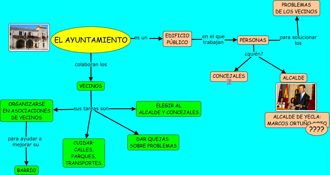 Este Cmap, tiene información relacionada con: AYUNTAMIENTO, VECINOS sus tareas son ORGANIZARSE EN ASOCIACIONES DE VECINOS, VECINOS sus tareas son ELEGIR AL ALCALDE Y CONCEJALES, PERSONAS para solucionar los PROBLEMAS DE LOS VECINOS, EL AYUNTAMIENTO es un EDIFICIO PÚBLICO, VECINOS sus tareas son CUIDAR: CALLES, PARQUES, TRANSPORTES., EDIFICIO PÚBLICO en el que trabajan PERSONAS, VECINOS sus tareas son DAR QUEJAS SOBRE PROBLEMAS, PERSONAS ¿quién? CONCEJALES, PERSONAS ¿quién? ALCALDE, ORGANIZARSE EN ASOCIACIONES DE VECINOS para ayudar a mejorar su BARRIO, EL AYUNTAMIENTO colaboran los VECINOS