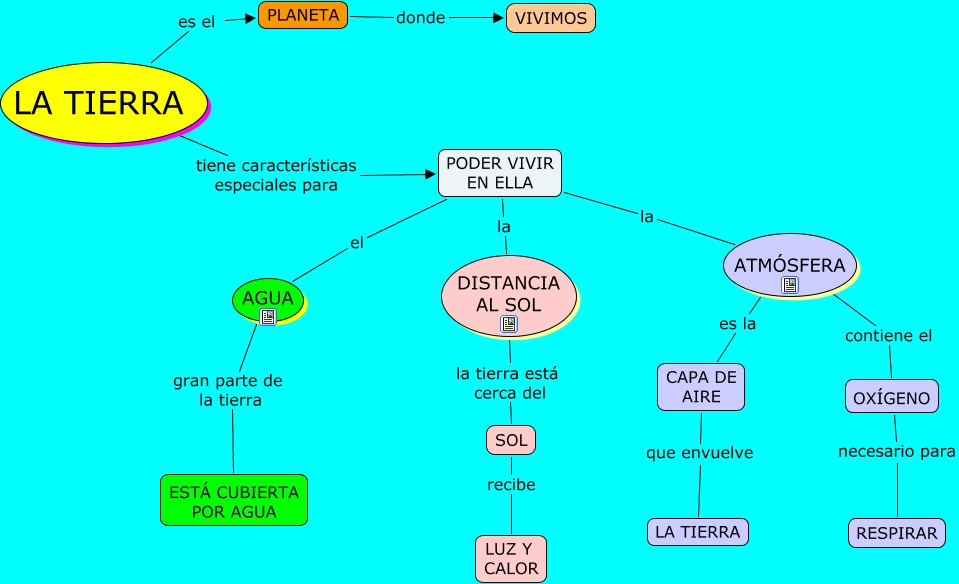 Este Cmap, tiene información relacionada con: LA TIERRA 2º A, LA TIERRA es el PLANETA, AGUA gran parte de la tierra EST�? CUBIERTA POR AGUA, SOL recibe LUZ Y CALOR, PODER VIVIR EN ELLA el AGUA, LA TIERRA tiene características especiales para PODER VIVIR EN ELLA, DISTANCIA AL SOL la tierra está cerca del SOL, PLANETA donde VIVIMOS, PODER VIVIR EN ELLA la ATMÓSFERA, PODER VIVIR EN ELLA la DISTANCIA AL SOL, ATMÓSFERA es la CAPA DE AIRE, ATMÓSFERA contiene el OX�?GENO, OX�?GENO necesario para RESPIRAR, CAPA DE AIRE que envuelve LA TIERRA