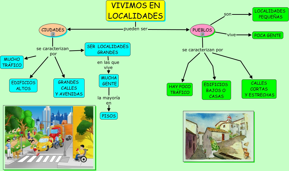 Este Cmap, tiene información relacionada con: LOCALIDADES 2º, PUEBLOS se caracterizan por EDIFICIOS BAJOS O CASAS, SER LOCALIDADES GRANDES en las que vive MUCHA GENTE, VIVIMOS EN LOCALIDADES pueden ser CIUDADES, CIUDADES se caracterizan por SER LOCALIDADES GRANDES, CIUDADES se caracterizan por GRANDES CALLES Y AVENIDAS, CIUDADES se caracterizan por EDIFICIOS ALTOS, PUEBLOS se caracterizan por CALLES CORTAS Y ESTRECHAS, MUCHA GENTE la mayoría en PISOS, PUEBLOS se caracterizan por HAY POCO TR�?FICO, CIUDADES se caracterizan por MUCHO TR�?FICO, VIVIMOS EN LOCALIDADES pueden ser PUEBLOS, PUEBLOS vive POCA GENTE, PUEBLOS son LOCALIDADES PEQUEÑAS