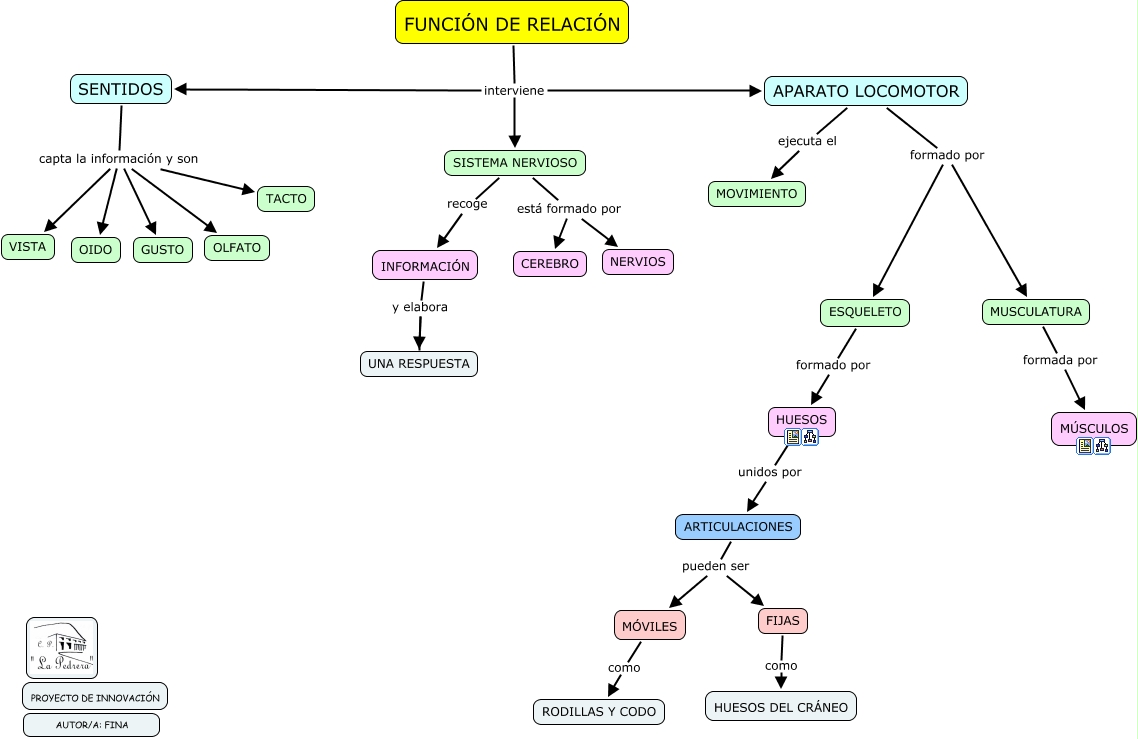 Este Cmap, tiene información relacionada con: FUNCIÓN DE RELACIÓN 4º PRIMARIA, ARTICULACIONES pueden ser MÓVILES, SISTEMA NERVIOSO está formado por NERVIOS, SENTIDOS capta la información y son GUSTO, FIJAS como HUESOS DEL CR�?NEO, FUNCIÓN DE RELACIÓN interviene SISTEMA NERVIOSO, FUNCIÓN DE RELACIÓN interviene SENTIDOS, SISTEMA NERVIOSO recoge INFORMACIÓN, MUSCULATURA formada por MÚSCULOS, APARATO LOCOMOTOR formado por MUSCULATURA, SISTEMA NERVIOSO está formado por CEREBRO, APARATO LOCOMOTOR ejecuta el MOVIMIENTO, SENTIDOS capta la información y son OLFATO, INFORMACIÓN y elabora UNA RESPUESTA, HUESOS unidos por ARTICULACIONES, APARATO LOCOMOTOR formado por ESQUELETO, ARTICULACIONES pueden ser FIJAS, ESQUELETO formado por HUESOS, FUNCIÓN DE RELACIÓN interviene APARATO LOCOMOTOR, SENTIDOS capta la información y son VISTA, SENTIDOS capta la información y son OIDO