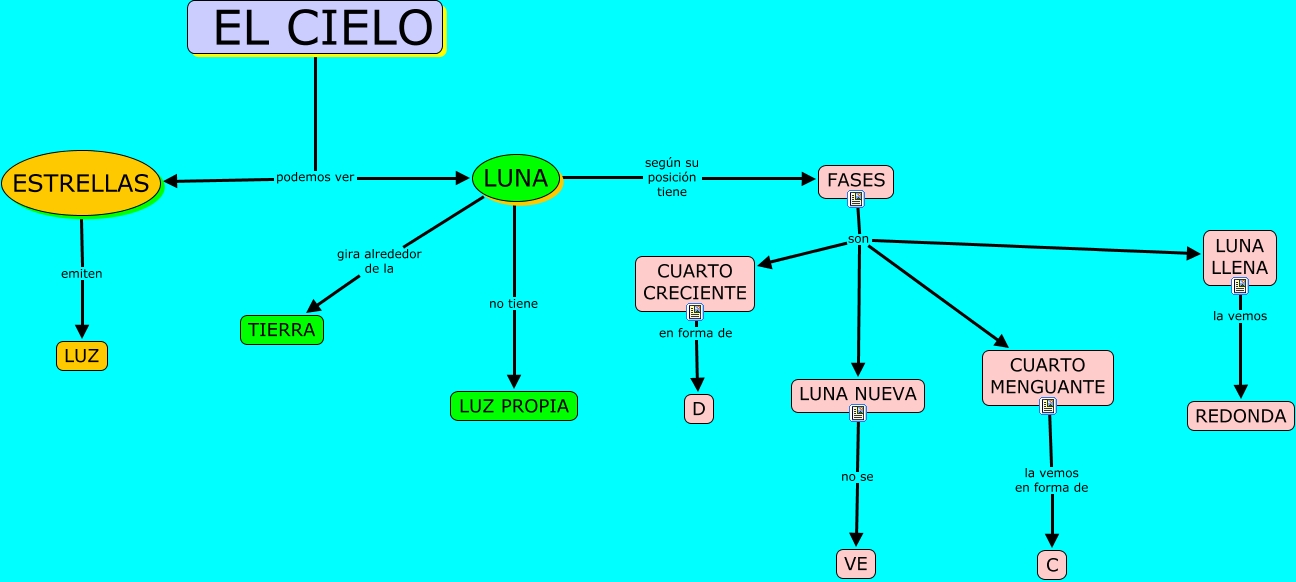 Este Cmap, tiene información relacionada con: EL CIELO, LUNA gira alrededor de la TIERRA, CUARTO MENGUANTE la vemos en forma de C, FASES son CUARTO MENGUANTE, FASES son LUNA LLENA, LUNA no tiene LUZ PROPIA, LUNA según su posición tiene FASES, EL CIELO podemos ver ESTRELLAS, FASES son LUNA NUEVA, ESTRELLAS emiten LUZ, LUNA NUEVA no se VE, EL CIELO podemos ver LUNA, FASES son CUARTO CRECIENTE, LUNA LLENA la vemos REDONDA, CUARTO CRECIENTE en forma de D
