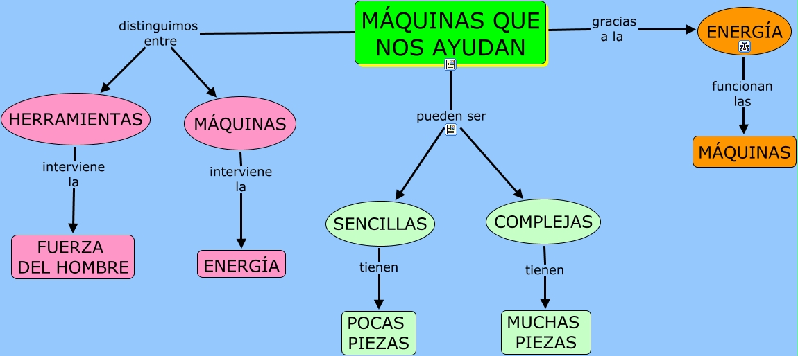 Este Cmap, tiene información relacionada con: M�?QUINAS 1º, HERRAMIENTAS interviene la FUERZA DEL HOMBRE, M�?QUINAS QUE NOS AYUDAN pueden ser SENCILLAS, COMPLEJAS tienen MUCHAS PIEZAS, M�?QUINAS QUE NOS AYUDAN distinguimos entre M�?QUINAS, M�?QUINAS interviene la ENERG�?A, M�?QUINAS QUE NOS AYUDAN distinguimos entre HERRAMIENTAS, M�?QUINAS QUE NOS AYUDAN gracias a la ENERG�?A, SENCILLAS tienen POCAS PIEZAS, ENERG�?A funcionan las M�?QUINAS, M�?QUINAS QUE NOS AYUDAN pueden ser COMPLEJAS
