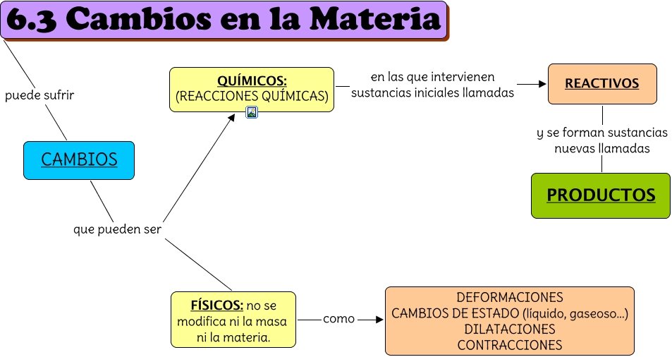 Este Cmap, tiene información relacionada con: 6.3 CAMBIOS EN LA MATERIA, CAMBIOS que pueden ser F�?SICOS: no se modifica ni la masa ni la materia., 6.3 Cambios en la Materia puede sufrir CAMBIOS, QU�?MICOS: (REACCIONES QU�?MICAS) en las que intervienen sustancias iniciales llamadas REACTIVOS, CAMBIOS que pueden ser QU�?MICOS: (REACCIONES QU�?MICAS), F�?SICOS: no se modifica ni la masa ni la materia. como DEFORMACIONES CAMBIOS DE ESTADO (líquido, gaseoso...) DILATACIONES CONTRACCIONES, REACTIVOS y se forman sustancias nuevas llamadas PRODUCTOS