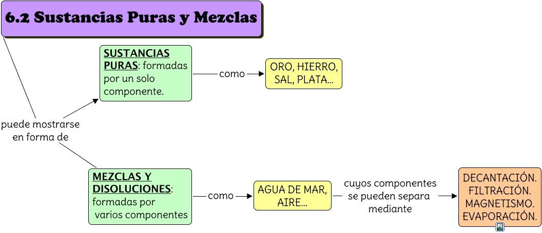Este Cmap, tiene información relacionada con: 6.2 MEZCLAS, AGUA DE MAR, AIRE... cuyos componentes se pueden separa mediante DECANTACIÓN. FILTRACIÓN. MAGNETISMO. EVAPORACIÓN., SUSTANCIAS PURAS: formadas por un solo componente. como ORO, HIERRO, SAL, PLATA..., MEZCLAS Y DISOLUCIONES: formadas por varios componentes como AGUA DE MAR, AIRE..., 6.2 Sustancias Puras y Mezclas puede mostrarse en forma de SUSTANCIAS PURAS: formadas por un solo componente., 6.2 Sustancias Puras y Mezclas puede mostrarse en forma de MEZCLAS Y DISOLUCIONES: formadas por varios componentes