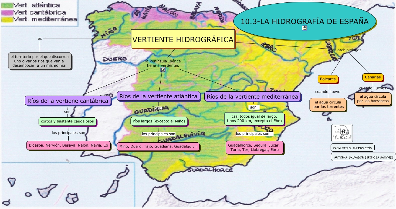 Este Cmap, tiene información relacionada con: 10.3-LA HIDROGRAF�?A DE ESPAÑA, VERTIENTE HIDROGR�?FICA es el territorio por el que discurren uno o varios rios que van a desembocar a un mismo mar, VERTIENTE HIDROGR�?FICA la Península Ibérica tiene 3 vertientes Ríos de la vertiene cantábrica, VERTIENTE HIDROGR�?FICA la Península Ibérica tiene 3 vertientes Ríos de la vertiente atlántica, Canarias cuando llueves el agua circula por los barrancos, cortos y bastante caudalosos los principales son Bidasoa, Nervión, Besaya, Nalón, Navia, Eo, VERTIENTE HIDROGR�?FICA la Península Ibérica tiene 3 vertientes Ríos de la vertiente mediterránea, Baleares cuando llueve el agua circula por los torrentes, Ríos de la vertiente atlántica son ríos largos (excepto el Miño), ríos largos (excepto el Miño) los principales son Miño, Duero, Tajo, Guadiana, Guadalquivir, Ríos de la vertiene cantábrica son cortos y bastante caudalosos, Ríos de la vertiente mediterránea son casi todos igual de largo. Unos 200 km, excepto el Ebro, casi todos igual de largo. Unos 200 km, excepto el Ebro los principales son Guadalhorce, Segura, Júcar, Turia, Ter, Llobregat, Ebro, VERTIENTE HIDROGR�?FICA los archipiélagos Canarias, VERTIENTE HIDROGR�?FICA los archipiélagos Baleares