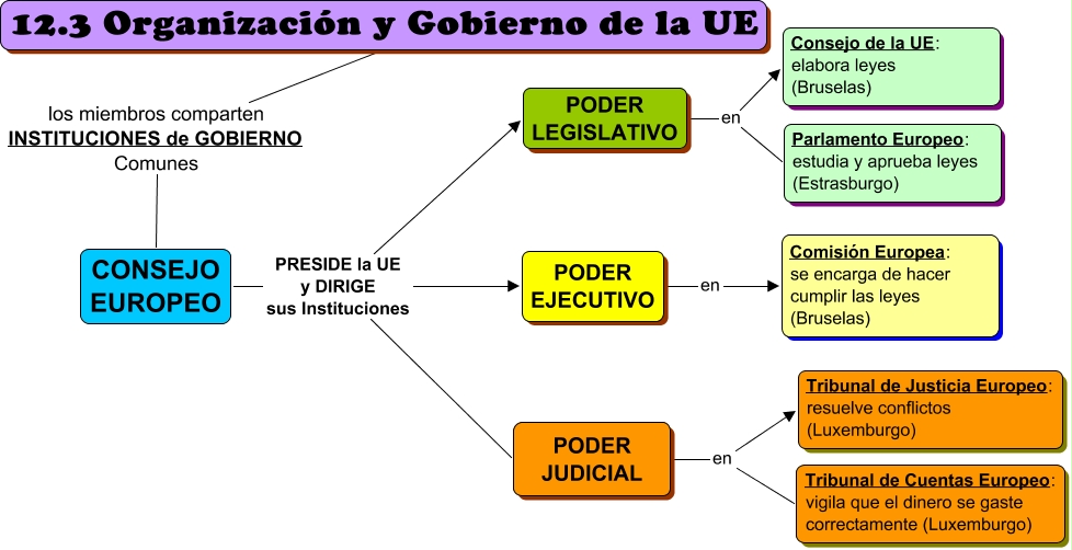 Este Cmap, tiene información relacionada con: 12.3 Organizacion y gobierno UE, CONSEJO EUROPEO PRESIDE la UE y DIRIGE sus Instituciones PODER JUDICIAL, PODER LEGISLATIVO en Parlamento Europeo: estudia y aprueba leyes (Estrasburgo), CONSEJO EUROPEO PRESIDE la UE y DIRIGE sus Instituciones PODER LEGISLATIVO, PODER EJECUTIVO en Comisión Europea: se encarga de hacer cumplir las leyes (Bruselas), CONSEJO EUROPEO PRESIDE la UE y DIRIGE sus Instituciones PODER EJECUTIVO, 12.3 Organización y Gobierno de la UE los miembros comparten INSTITUCIONES de GOBIERNO Comunes CONSEJO EUROPEO, PODER JUDICIAL en Tribunal de Justicia Europeo: resuelve conflictos (Luxemburgo), PODER LEGISLATIVO en Consejo de la UE: elabora leyes (Bruselas), PODER JUDICIAL en Tribunal de Cuentas Europeo: vigila que el dinero se gaste correctamente (Luxemburgo)