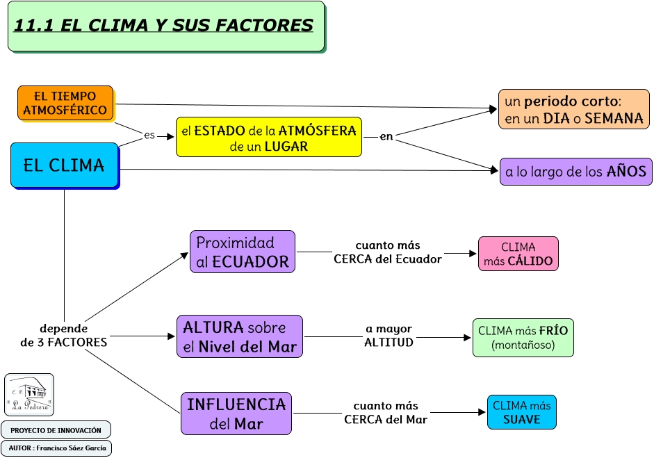 Este Cmap, tiene información relacionada con: 11.1- EL CLIMA Y SUS FACTORES, EL CLIMA depende de 3 FACTORES ALTURA sobre el Nivel del Mar, EL CLIMA es el ESTADO de la ATMÓSFERA de un LUGAR, el ESTADO de la ATMÓSFERA de un LUGAR en un periodo corto: en un DIA o SEMANA, EL TIEMPO ATMOSFÉRICO es el ESTADO de la ATMÓSFERA de un LUGAR, EL TIEMPO ATMOSFÉRICO ???? un periodo corto: en un DIA o SEMANA, ALTURA sobre el Nivel del Mar a mayor ALTITUD CLIMA más FR�?O (montañoso), EL CLIMA depende de 3 FACTORES Proximidad al ECUADOR, el ESTADO de la ATMÓSFERA de un LUGAR en a lo largo de los AÑOS, INFLUENCIA del Mar cuanto más CERCA del Mar CLIMA más SUAVE, EL CLIMA depende de 3 FACTORES INFLUENCIA del Mar, Proximidad al ECUADOR cuanto más CERCA del Ecuador CLIMA más C�?LIDO, EL CLIMA ???? a lo largo de los AÑOS