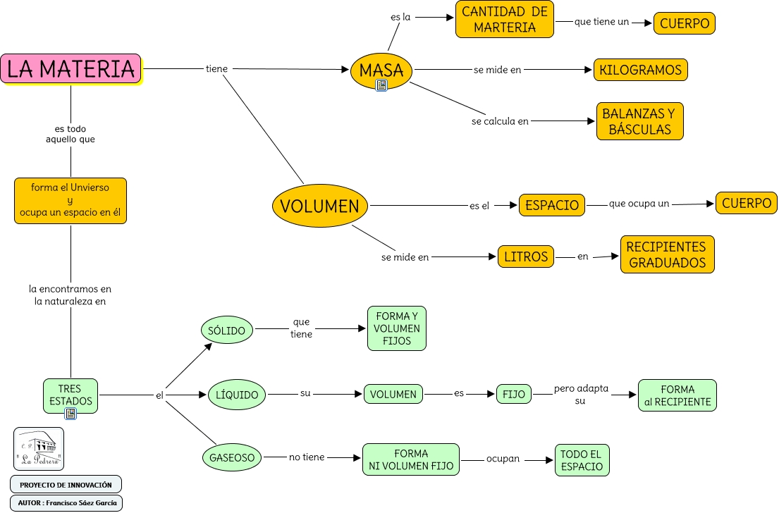 Este Cmap, tiene información relacionada con: 1- LA MATERIA Y SU MEDIDA, FORMA NI VOLUMEN FIJO ocupan TODO EL ESPACIO, LA MATERIA es todo aquello que forma el Unvierso y ocupa un espacio en él, forma el Unvierso y ocupa un espacio en él la encontramos en la naturaleza en TRES ESTADOS, MASA se mide en KILOGRAMOS, LITROS en RECIPIENTES GRADUADOS, FIJO pero adapta su FORMA al RECIPIENTE, SÓLIDO que tiene FORMA Y VOLUMEN FIJOS, MASA se calcula en BALANZAS Y B�?SCULAS, MASA es la CANTIDAD DE MARTERIA, VOLUMEN es el ESPACIO, TRES ESTADOS el GASEOSO, LA MATERIA tiene VOLUMEN, L�?QUIDO su VOLUMEN, TRES ESTADOS el L�?QUIDO, LA MATERIA tiene MASA, ESPACIO que ocupa un CUERPO, CANTIDAD DE MARTERIA que tiene un CUERPO, VOLUMEN es FIJO, VOLUMEN se mide en LITROS, TRES ESTADOS el SÓLIDO