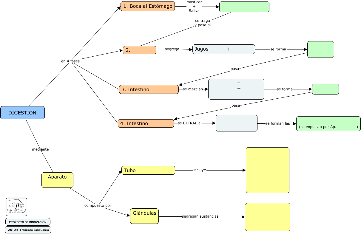 Este Cmap, tiene información relacionada con: DIGESTIÓN MUDO, pasa 3. Intestino, 2. segrega Jugos +, se traga y pasa al 2., + + se forma, DIGESTION en 4 fases 3. Intestino, Aparato compuesto por Tubo, DIGESTION en 4 fases 1. Boca al Estómago, DIGESTION en 4 fases 4. Intestino, 3. Intestino se mezclan + +, se forman las (se expulsan por Ap. ), Jugos + se forma, 1. Boca al Estómago masticar + Saliva, pasa 4. Intestino, 4. Intestino se EXTRAE el, Aparato compuesto por Glándulas, DIGESTION mediante Aparato, DIGESTION en 4 fases 2., Glándulas segregan sustancias, Tubo incluye
