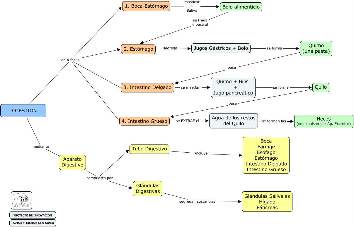 Este Cmap, tiene información relacionada con: 3 - DIGESTIÓN, Jugos Gástricos + Bolo se forma Quimo (una pasta), Aparato Digestivo compuesto por Tubo Digestivo, Quimo (una pasta) pasa 3. Intestino Delgado, Bolo alimenticio se traga y pasa al 2. Estómago, 2. Estómago segrega Jugos Gástricos + Bolo, 4. Intestino Grueso se EXTRAE el Agua de los restos del Quilo, Tubo Digestivo incluye Boca Faringe Esófago Estómago Intestino Delgado Intestino Grueso, DIGESTION en 4 fases 3. Intestino Delgado, DIGESTION en 4 fases 2. Estómago, Quimo + Bilis + Jugo pancreático se forma Quilo, Glándulas Digestivas segregan sustancias Glándulas Salivales Hígado Páncreas, DIGESTION mediante Aparato Digestivo, Quilo pasa 4. Intestino Grueso, Aparato Digestivo compuesto por Glándulas Digestivas, 1. Boca-Estómago masticar + Saliva Bolo alimenticio, DIGESTION en 4 fases 1. Boca-Estómago, DIGESTION en 4 fases 4. Intestino Grueso, 3. Intestino Delgado se mezclan Quimo + Bilis + Jugo pancreático, Agua de los restos del Quilo se forman las Heces (se expulsan por Ap. Excretor)