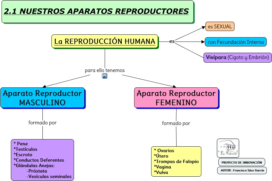 Este Cmap, tiene información relacionada con: 2.1 NUESTROS APARATOS REPRODUCTORES, La REPRODUCCIÓN HUMANA es con Fecundación Interna, La REPRODUCCIÓN HUMANA es es SEXUAL, La REPRODUCCIÓN HUMANA es Vivípara (Cigoto y Embrión), Aparato Reproductor FEMENINO formado por * Ovarios *Útero *Trompas de Falopio *Vagina *Vulva, Aparato Reproductor MASCULINO formado por * Pene *Testículos *Escroto *Conductos Deferentes *Glándulas Anejas: -Próstata -Vesículas seminales, La REPRODUCCIÓN HUMANA para ello tenemos Aparato Reproductor MASCULINO, La REPRODUCCIÓN HUMANA para ello tenemos Aparato Reproductor FEMENINO