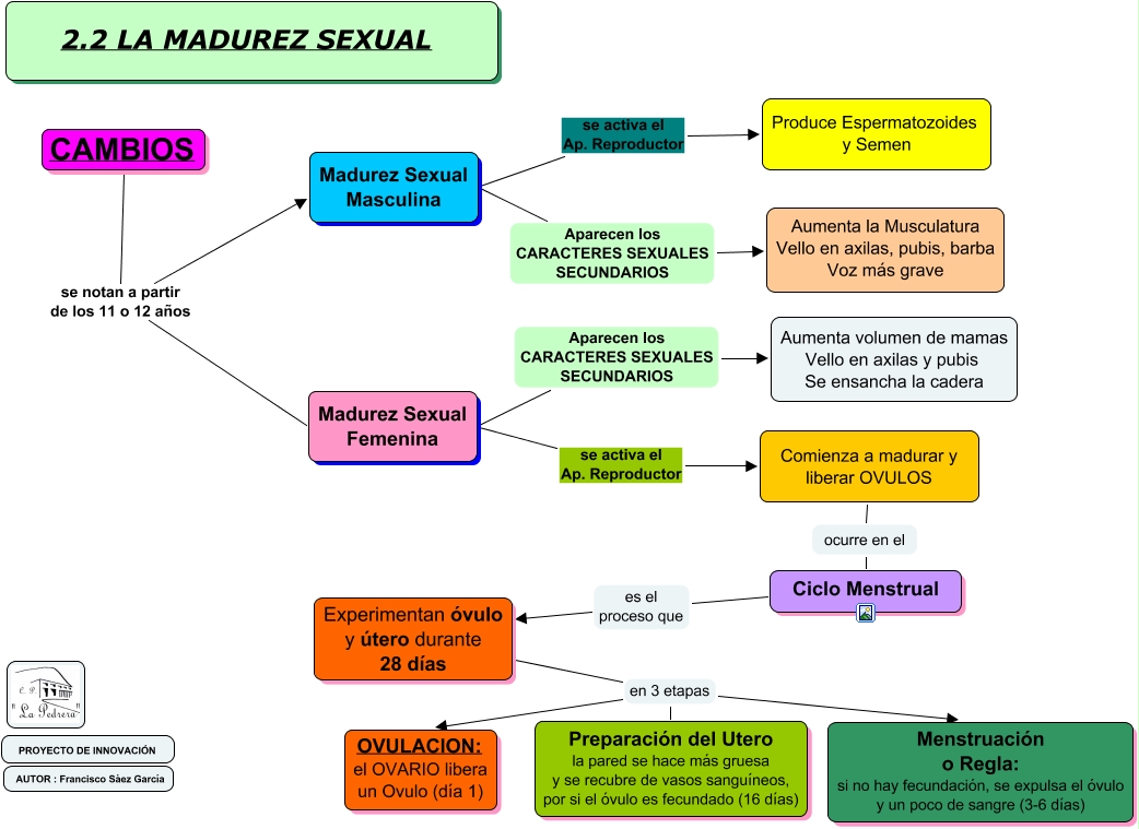 Este Cmap, tiene información relacionada con: 2.2 LA MADUREZ SEXUAL, Experimentan óvulo y útero durante 28 días en 3 etapas OVULACION: el OVARIO libera un Ovulo (día 1), CAMBIOS se notan a partir de los 11 o 12 años Madurez Sexual Femenina, Madurez Sexual Masculina Aparecen los CARACTERES SEXUALES SECUNDARIOS Aumenta la Musculatura Vello en axilas, pubis, barba Voz más grave, Comienza a madurar y liberar OVULOS ocurre en el Ciclo Menstrual, Madurez Sexual Femenina se activa el Ap. Reproductor Comienza a madurar y liberar OVULOS, Ciclo Menstrual es el proceso que Experimentan óvulo y útero durante 28 días, Experimentan óvulo y útero durante 28 días en 3 etapas Preparación del Utero la pared se hace más gruesa y se recubre de vasos sanguíneos, por si el óvulo es fecundado (16 días), Madurez Sexual Femenina Aparecen los CARACTERES SEXUALES SECUNDARIOS Aumenta volumen de mamas Vello en axilas y pubis Se ensancha la cadera, Madurez Sexual Masculina se activa el Ap. Reproductor Produce Espermatozoides y Semen, CAMBIOS se notan a partir de los 11 o 12 años Madurez Sexual Masculina, Experimentan óvulo y útero durante 28 días en 3 etapas Menstruación o Regla: si no hay fecundación, se expulsa el óvulo y un poco de sangre (3-6 días)