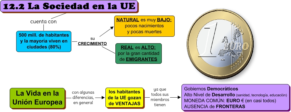 Este Cmap, tiene información relacionada con: 12.2 La Sociedad en la UE, los habitantes de la UE gozan de VENTAJAS ya que todos sus miembros tienen Gobiernos Democráticos Alto Nivel de Desarrollo (sanidad, tecnología, educación) MONEDA COMÚN: EURO € (en casi todos) AUSENCIA de FRONTERAS, 500 mill. de habitantes y la mayoría viven en ciudades (80%) su CRECIMIENTO NATURAL es muy BAJO: pocos nacimientos y pocas muertes, La Vida en la Unión Europea con algunas diferencias, en general los habitantes de la UE gozan de VENTAJAS, 500 mill. de habitantes y la mayoría viven en ciudades (80%) su CRECIMIENTO REAL es ALTO: por la gran cantidad de EMIGRANTES, 12.2 La Sociedad en la UE cuenta con 500 mill. de habitantes y la mayoría viven en ciudades (80%)
