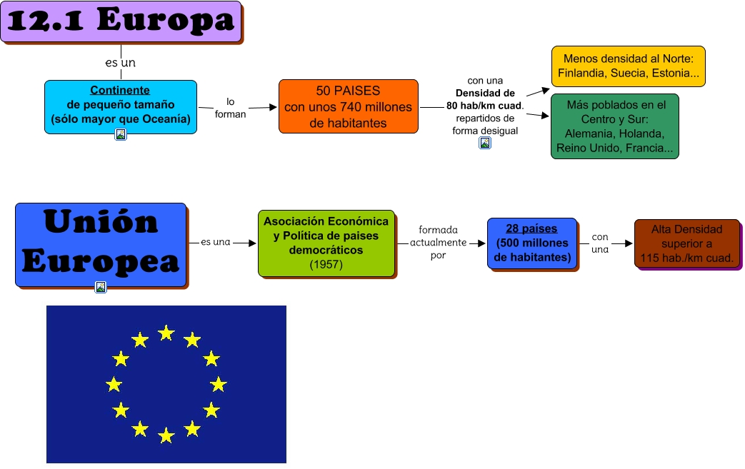 Este Cmap, tiene información relacionada con: 12.1 Europa y la Union Europea, 28 países (500 millones de habitantes) con una Alta Densidad superior a 115 hab./km cuad., 12.1 Europa es un Continente de pequeño tamaño (sólo mayor que Oceanía), Unión Europea es una Asociación Económica y Política de paises democráticos (1957), 50 PAISES con unos 740 millones de habitantes con una Densidad de 80 hab/km cuad. repartidos de forma desigual Menos densidad al Norte: Finlandia, Suecia, Estonia..., Asociación Económica y Política de paises democráticos (1957) formada actualmente por 28 países (500 millones de habitantes), 50 PAISES con unos 740 millones de habitantes con una Densidad de 80 hab/km cuad. repartidos de forma desigual Más poblados en el Centro y Sur: Alemania, Holanda, Reino Unido, Francia..., Continente de pequeño tamaño (sólo mayor que Oceanía) lo forman 50 PAISES con unos 740 millones de habitantes
