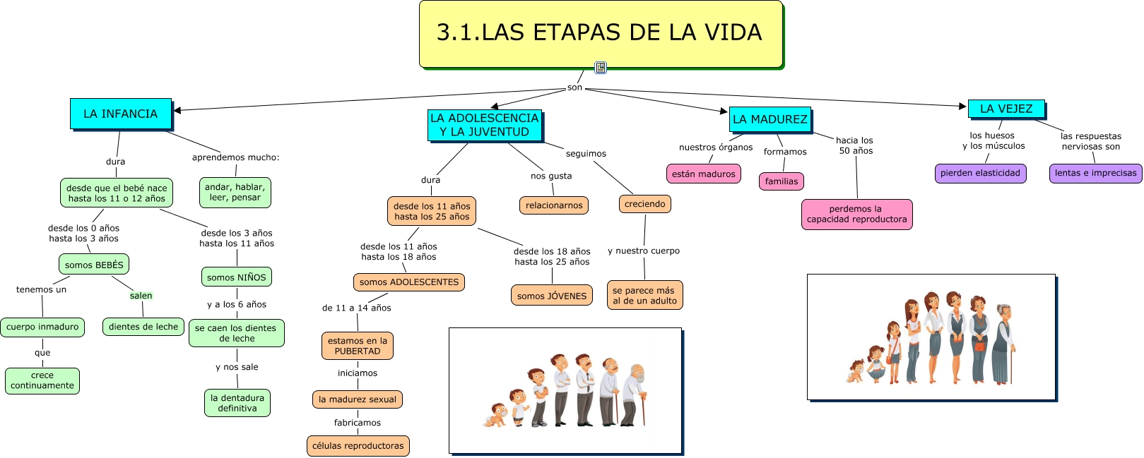 Este Cmap, tiene información relacionada con: LAS ETAPAS DE LA VIDA, 3.1.LAS ETAPAS DE LA VIDA son LA INFANCIA, 3.1.LAS ETAPAS DE LA VIDA son LA VEJEZ, LA ADOLESCENCIA Y LA JUVENTUD dura desde los 11 años hasta los 25 años, desde los 11 años hasta los 25 años desde los 11 años hasta los 18 años somos ADOLESCENTES, 3.1.LAS ETAPAS DE LA VIDA son LA MADUREZ, estamos en la PUBERTAD iniciamos la madurez sexual, LA INFANCIA aprendemos mucho: andar, hablar, leer, pensar, LA MADUREZ nuestros órganos están maduros, LA MADUREZ formamos familias, LA VEJEZ los huesos y los músculos pierden elasticidad, somos BEBÉS salen dientes de leche, la madurez sexual fabricamos células reproductoras, somos ADOLESCENTES de 11 a 14 años estamos en la PUBERTAD, cuerpo inmaduro que crece continuamente, LA ADOLESCENCIA Y LA JUVENTUD seguimos creciendo, LA VEJEZ las respuestas nerviosas son lentas e imprecisas, somos BEBÉS tenemos un cuerpo inmaduro, creciendo y nuestro cuerpo se parece más al de un adulto, 3.1.LAS ETAPAS DE LA VIDA son LA ADOLESCENCIA Y LA JUVENTUD, somos NIÑOS y a los 6 años se caen los dientes de leche