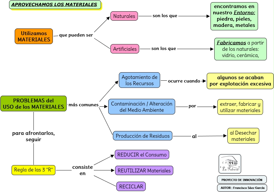 Este Cmap, tiene información relacionada con: 4 - APROVECHAMOS LOS MATERIALES, Utilizamos MATERIALES que pueden ser Artificiales, Agotamiento de los Recursos ocurre cuando algunos se acaban por explotación excesiva, Contaminación / Alteración del Medio Ambiente por extraer, fabricar y utilizar materiales, PROBLEMAS del USO de los MATERIALES más comunes Producción de Residuos, Regla de las 3 "R" consiste en RECICLAR, Producción de Residuos al al Desechar materiales, Regla de las 3 "R" consiste en REDUCIR el Consumo, Naturales son los que encontramos en nuestro Entorno: piedra, pieles, madera, metales, Utilizamos MATERIALES que pueden ser Naturales, PROBLEMAS del USO de los MATERIALES para afrontarlos, seguir Regla de las 3 "R", Regla de las 3 "R" consiste en REUTILIZAR Materiales, Artificiales son los que Fabricamos a partir de los naturales: vidrio, cerámica,, PROBLEMAS del USO de los MATERIALES más comunes Agotamiento de los Recursos, PROBLEMAS del USO de los MATERIALES más comunes Contaminación / Alteración del Medio Ambiente