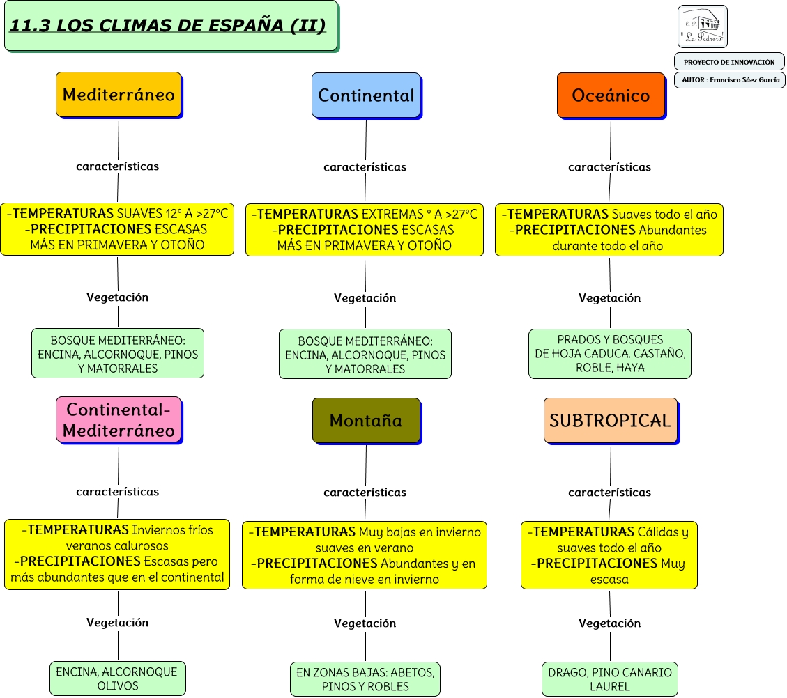 Este Cmap, tiene información relacionada con: 11.3 - LOS CLIMAS DE ESPAÑA (II), SUBTROPICAL características -TEMPERATURAS Cálidas y suaves todo el año -PRECIPITACIONES Muy escasa, Mediterráneo características -TEMPERATURAS SUAVES 12º A ᡓºC -PRECIPITACIONES ESCASAS M�?S EN PRIMAVERA Y OTOÑO, Montaña características -TEMPERATURAS Muy bajas en invierno suaves en verano -PRECIPITACIONES Abundantes y en forma de nieve en invierno, Oceánico características -TEMPERATURAS Suaves todo el año -PRECIPITACIONES Abundantes durante todo el año, -TEMPERATURAS Cálidas y suaves todo el año -PRECIPITACIONES Muy escasa Vegetación DRAGO, PINO CANARIO LAUREL, Continental- Mediterráneo características -TEMPERATURAS Inviernos fríos veranos calurosos -PRECIPITACIONES Escasas pero más abundantes que en el continental, Continental características -TEMPERATURAS EXTREMAS º A ᡓºC -PRECIPITACIONES ESCASAS M�?S EN PRIMAVERA Y OTOÑO, -TEMPERATURAS Inviernos fríos veranos calurosos -PRECIPITACIONES Escasas pero más abundantes que en el continental Vegetación ENCINA, ALCORNOQUE OLIVOS, -TEMPERATURAS Muy bajas en invierno suaves en verano -PRECIPITACIONES Abundantes y en forma de nieve en invierno Vegetación EN ZONAS BAJAS: ABETOS, PINOS Y ROBLES, -TEMPERATURAS Suaves todo el año -PRECIPITACIONES Abundantes durante todo el año Vegetación PRADOS Y BOSQUES DE HOJA CADUCA. CASTAÑO, ROBLE, HAYA, -TEMPERATURAS EXTREMAS º A ᡓºC -PRECIPITACIONES ESCASAS M�?S EN PRIMAVERA Y OTOÑO Vegetación BOSQUE MEDITERR�?NEO: ENCINA, ALCORNOQUE, PINOS Y MATORRALES, -TEMPERATURAS SUAVES 12º A ᡓºC -PRECIPITACIONES ESCASAS M�?S EN PRIMAVERA Y OTOÑO Vegetación BOSQUE MEDITERR�?NEO: ENCINA, ALCORNOQUE, PINOS Y MATORRALES