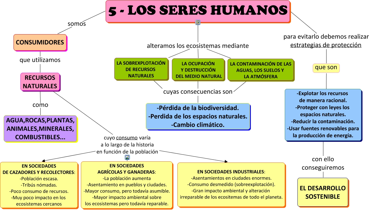 Este Cmap, tiene información relacionada con: 5 LOS SERES HUMANOS, RECURSOS NATURALES cuyo consumo varía a lo largo de la historia en función de la población EN SOCIEDADES DE CAZADORES Y RECOLECTORES: -Población escasa. -Tribús nómadas. -Poco consumo de recursos. -Muy poco impacto en los ecosistemas cercanos, LA CONTAMINACIÓN DE LAS AGUAS, LOS SUELOS Y LA ATMÓSFERA cuyas consecuencias son -Pérdida de la biodiversidad. -Perdida de los espacios naturales. -Cambio climático., LA SOBREXPLOTACIÓN DE RECURSOS NATURALES cuyas consecuencias son -Pérdida de la biodiversidad. -Perdida de los espacios naturales. -Cambio climático., que son ???? -Explotar los recursos de manera racional. -Proteger con leyes los espacios naturales. -Reducir la contaminación. -Usar fuentes renovables para la producción de energía., RECURSOS NATURALES cuyo consumo varía a lo largo de la historia en función de la población EN SOCIEDADES INDUSTRIALES: -Asentamientos en ciudades enormes. -Consumo desmedido (sobreexplotación). -Gran impacto ambiental y alteración irreparable de los ecositemas de todo el planeta., RECURSOS NATURALES cuyo consumo varía a lo largo de la historia en función de la población EN SOCIEDADES AGR�?COLAS Y GANADERAS: -La población aumenta -Asentamiento en pueblos y ciudades. -Mayor consumo, pero todavía asumible. -Mayor impacto ambiental sobre los ecosistemas pero todavía reparable., CONSUMIDORES que utilizamos RECURSOS NATURALES, -Explotar los recursos de manera racional. -Proteger con leyes los espacios naturales. -Reducir la contaminación. -Usar fuentes renovables para la producción de energía. con ello conseguiremos EL DESARROLLO SOSTENIBLE, LA OCUPACIÓN Y DESTRUCCIÓN DEL MEDIO NATURAL cuyas consecuencias son -Pérdida de la biodiversidad. -Perdida de los espacios naturales. -Cambio climático., 5 - LOS SERES HUMANOS somos CONSUMIDORES, 5 - LOS SERES HUMANOS alteramos los ecosistemas mediante LA CONTAMINACIÓN DE LAS AGUAS, LOS SUELOS Y LA ATMÓSFERA, 5 - LOS SERES HUMANOS para evitarlo debemos realizar estrategias de protección que son, 5 - LOS SERES HUMANOS alteramos los ecosistemas mediante LA SOBREXPLOTACIÓN DE RECURSOS NATURALES, 5 - LOS SERES HUMANOS alteramos los ecosistemas mediante LA OCUPACIÓN Y DESTRUCCIÓN DEL MEDIO NATURAL, RECURSOS NATURALES como AGUA,ROCAS,PLANTAS, ANIMALES,MINERALES, COMBUSTIBLES...