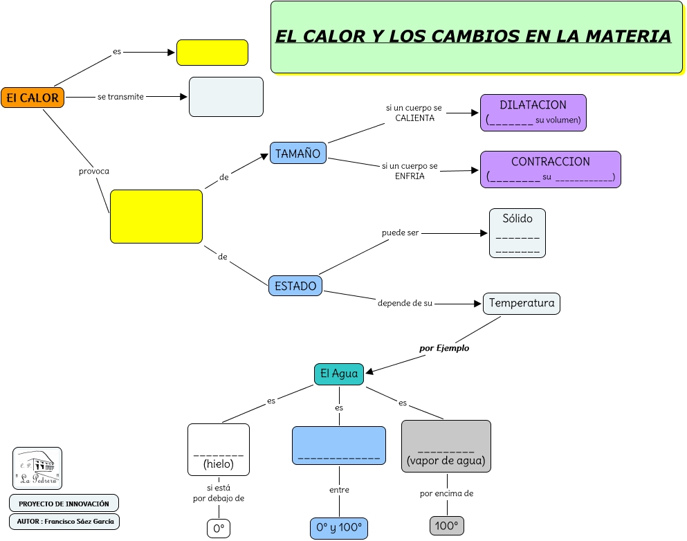 Este Cmap, tiene información relacionada con: EL CALOR Y LOS CAMBIOS-MUDO, El Agua es _____________, de ESTADO, Temperatura por Ejemplo El Agua, El CALOR provoca, El Agua es ________ (hielo), El CALOR se transmite, TAMAÑO si un cuerpo se ENFRIA CONTRACCION (________ su ____________), El Agua es _________ (vapor de agua), _____________ entre 0º y 100º, ________ (hielo) si está por debajo de 0º, ESTADO puede ser Sólido _______ _______, _________ (vapor de agua) por encima de 100º, El CALOR es, ESTADO depende de su Temperatura, TAMAÑO si un cuerpo se CALIENTA DILATACION (_______ su volumen), de TAMAÑO