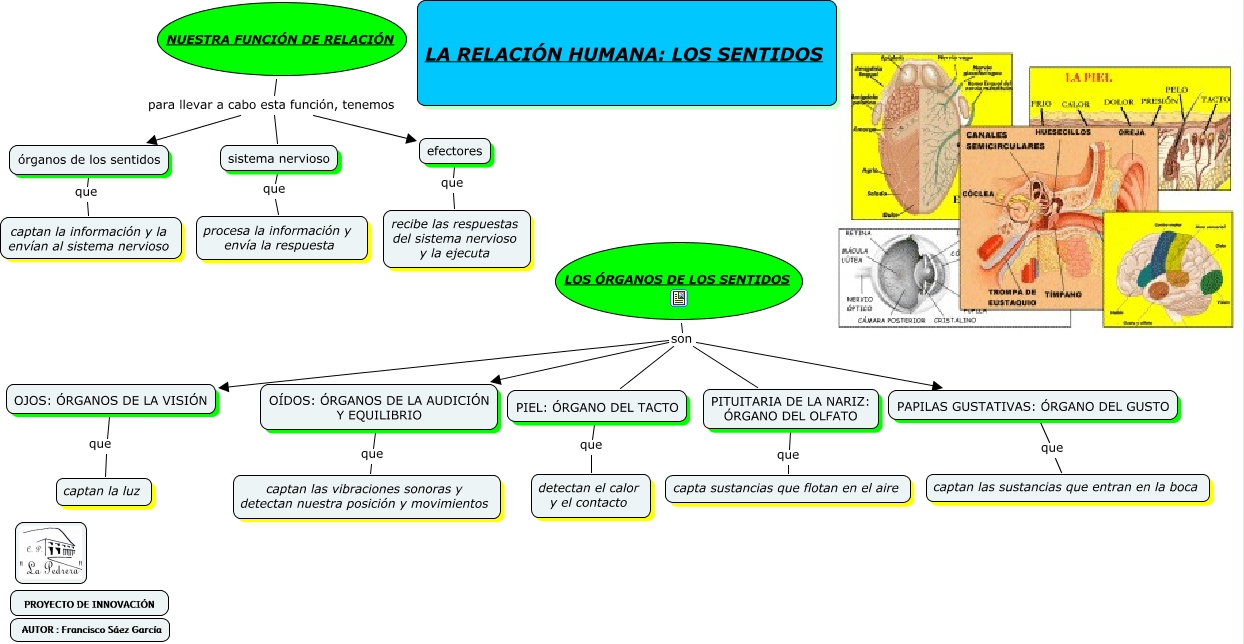 Este Cmap, tiene información relacionada con: 1 - LA RELACIÓN HUMANA- LOS SENTIDOS, NUESTRA FUNCIÓN DE RELACIÓN para llevar a cabo esta función, tenemos órganos de los sentidos, LOS ÓRGANOS DE LOS SENTIDOS son O�?DOS: ÓRGANOS DE LA AUDICIÓN Y EQUILIBRIO, PIEL: ÓRGANO DEL TACTO que detectan el calor y el contacto, efectores que recibe las respuestas del sistema nervioso y la ejecuta, LOS ÓRGANOS DE LOS SENTIDOS son PIEL: ÓRGANO DEL TACTO, PAPILAS GUSTATIVAS: ÓRGANO DEL GUSTO que captan las sustancias que entran en la boca, órganos de los sentidos que captan la información y la envían al sistema nervioso, LOS ÓRGANOS DE LOS SENTIDOS son PITUITARIA DE LA NARIZ: ÓRGANO DEL OLFATO, O�?DOS: ÓRGANOS DE LA AUDICIÓN Y EQUILIBRIO que captan las vibraciones sonoras y detectan nuestra posición y movimientos, PITUITARIA DE LA NARIZ: ÓRGANO DEL OLFATO que capta sustancias que flotan en el aire, LOS ÓRGANOS DE LOS SENTIDOS son OJOS: ÓRGANOS DE LA VISIÓN, NUESTRA FUNCIÓN DE RELACIÓN para llevar a cabo esta función, tenemos sistema nervioso, sistema nervioso que procesa la información y envía la respuesta, NUESTRA FUNCIÓN DE RELACIÓN para llevar a cabo esta función, tenemos efectores, LOS ÓRGANOS DE LOS SENTIDOS son PAPILAS GUSTATIVAS: ÓRGANO DEL GUSTO, OJOS: ÓRGANOS DE LA VISIÓN que captan la luz