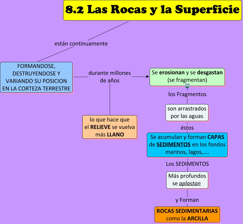 Este Cmap, tiene información relacionada con: 8.2 - Las rocas y la superficie, FORMANDOSE, DESTRUYENDOSE Y VARIANDO SU POSICION EN LA CORTEZA TERRESTRE durante millones de años lo que hace que el RELIEVE se vuelva más LLANO, Se erosionan y se desgastan (se fragmentan) los Fragmentos son arrastrados por las aguas, FORMANDOSE, DESTRUYENDOSE Y VARIANDO SU POSICION EN LA CORTEZA TERRESTRE durante millones de años Se erosionan y se desgastan (se fragmentan), 8.2 Las Rocas y la Superficie están continuamente FORMANDOSE, DESTRUYENDOSE Y VARIANDO SU POSICION EN LA CORTEZA TERRESTRE, Se acumulan y forman CAPAS de SEDIMENTOS en los fondos marinos, lagos,.... Los SEDIMENTOS Más profundos se aplastan, son arrastrados por las aguas éstos Se acumulan y forman CAPAS de SEDIMENTOS en los fondos marinos, lagos,...., Más profundos se aplastan y Forman ROCAS SEDIMENTARIAS como la ARCILLA