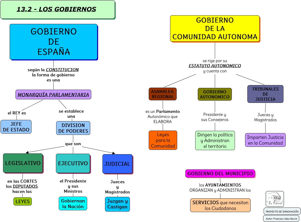 Este Cmap, tiene información relacionada con: 13.2 - LOS GOBIERNOS, GOBIERNO DEL MUNICIPIO los AYUNTAMIENTOS ORGANIZAN y ADMINISTRAN los SERVICIOS que necesitan los Ciudadanos, MONARQU�?A PARLAMENTARIA el REY es JEFE DE ESTADO, LEGISLATIVO en las CORTES los DIPUTADOS hacen las LEYES, GOBIERNO DE LA COMUNIDAD AUTONOMA se rige por su ESTATUTO AUTONOMICO y cuenta con ASAMBLEA REGIONAL, GOBIERNO DE ESPAÑA según la CONSTITUCION la forma de gobierno es una MONARQU�?A PARLAMENTARIA, DIVISION DE PODERES que son JUDICIAL, JUDICIAL Jueces y Magistrados Juzgan y Castigan, EJECUTIVO el Presidente y sus Ministros Gobiernan la Nación, GOBIERNO DE LA COMUNIDAD AUTONOMA se rige por su ESTATUTO AUTONOMICO y cuenta con GOBIERNO AUTONOMICO, GOBIERNO DE LA COMUNIDAD AUTONOMA se rige por su ESTATUTO AUTONOMICO y cuenta con TRIBUNALES DE JUSTICIA, GOBIERNO AUTONOMICO Presidente y sus Consejeros Dirigen la política y Administran el territorio, MONARQU�?A PARLAMENTARIA se establece una DIVISION DE PODERES, DIVISION DE PODERES que son EJECUTIVO, DIVISION DE PODERES que son LEGISLATIVO, ASAMBLEA REGIONAL es un Parlamento Autonómico que ELABORA Leyes para la Comunidad, TRIBUNALES DE JUSTICIA Jueces y Magistrados Imparten Justicia en la Comunidad