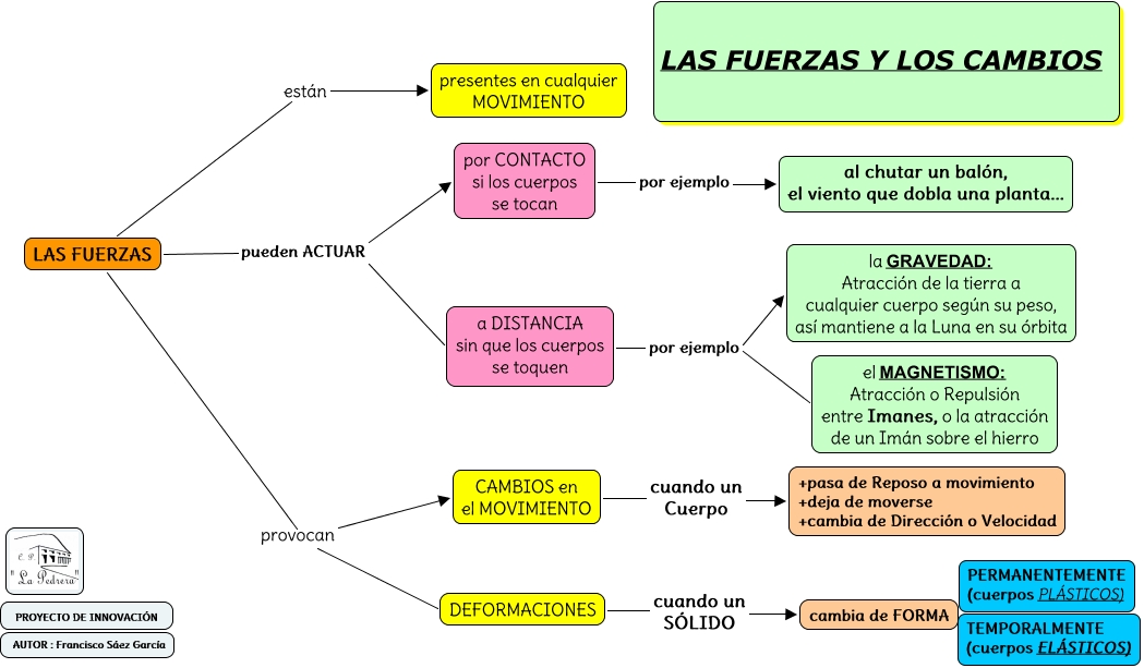 Este Cmap, tiene información relacionada con: 3 - LAS FUERZAS Y LOS CAMBIOS, LAS FUERZAS están presentes en cualquier MOVIMIENTO, LAS FUERZAS provocan CAMBIOS en el MOVIMIENTO, CAMBIOS en el MOVIMIENTO cuando un Cuerpo +pasa de Reposo a movimiento +deja de moverse +cambia de Dirección o Velocidad, DEFORMACIONES cuando un SÓLIDO cambia de FORMA, a DISTANCIA sin que los cuerpos se toquen por ejemplo el MAGNETISMO: Atracción o Repulsión entre Imanes, o la atracción de un Imán sobre el hierro, por CONTACTO si los cuerpos se tocan por ejemplo al chutar un balón, el viento que dobla una planta..., LAS FUERZAS pueden ACTUAR a DISTANCIA sin que los cuerpos se toquen, a DISTANCIA sin que los cuerpos se toquen por ejemplo la GRAVEDAD: Atracción de la tierra a cualquier cuerpo según su peso, así mantiene a la Luna en su órbita, LAS FUERZAS pueden ACTUAR por CONTACTO si los cuerpos se tocan, LAS FUERZAS provocan DEFORMACIONES