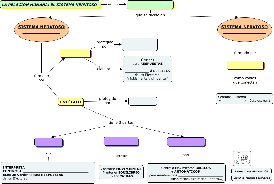 Este Cmap, tiene información relacionada con: LA RELACIÓN HUMANA - EL SISTEMA NERVIOSO - MUDO, SISTEMA NERVIOSO _____________ formado por, SISTEMA NERVIOSO _____________ formado por ENCÉFALO, permite Controlar MOVIMIENTOS Mantener EQUILIBRIO Evitar CAIDAS, elabora Órdenes para RESPUESTAS ___________ ó REFLEJAS de los Efectores (rápidamente y sin pensar), que Controla Movimientos B�?SICOS y AUTOM�?TICOS para mantenernos _______________________ ___________ (inspiración, expiración, latidos...), LA RELACIÓN HUMANA: EL SISTEMA NERVIOSO es una, que se divide en SISTEMA NERVIOSO _____________, ENCÉFALO tiene 3 partes, ENCÉFALO tiene 3 partes, ENCÉFALO tiene 3 partes, ENCÉFALO protegido por, que se divide en SISTEMA NERVIOSO _______________, que INTERPRETA ________________________________ CONTROLA __________________________________ ELABORA órdenes para RESPUESTAS ____________ de los Efectores, SISTEMA NERVIOSO _______________ formado por, como cables que conectan Sentidos, Sistema_____________ y____________ (músculos, etc.), protegida por l