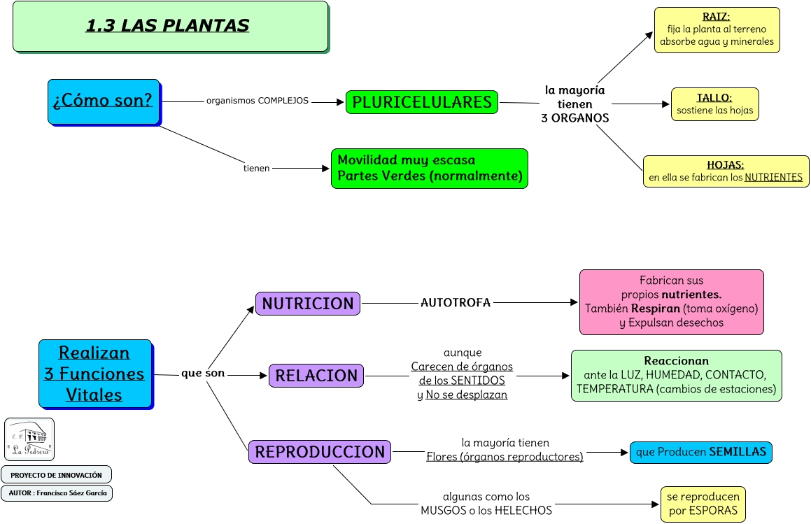 Este Cmap, tiene información relacionada con: 1.3 - LAS PLANTAS, Realizan 3 Funciones Vitales que son NUTRICION, PLURICELULARES la mayoría tienen 3 ORGANOS TALLO: sostiene las hojas, Realizan 3 Funciones Vitales que son REPRODUCCION, ¿Cómo son? organismos COMPLEJOS PLURICELULARES, ¿Cómo son? tienen Movilidad muy escasa Partes Verdes (normalmente), PLURICELULARES la mayoría tienen 3 ORGANOS RAIZ: fija la planta al terreno absorbe agua y minerales, REPRODUCCION la mayoría tienen Flores (órganos reproductores) que Producen SEMILLAS, NUTRICION AUTOTROFA Fabrican sus propios nutrientes. También Respiran (toma oxígeno) y Expulsan desechos, REPRODUCCION algunas como los MUSGOS o los HELECHOS se reproducen por ESPORAS, PLURICELULARES la mayoría tienen 3 ORGANOS HOJAS: en ella se fabrican los NUTRIENTES, RELACION aunque Carecen de órganos de los SENTIDOS y No se desplazan Reaccionan ante la LUZ, HUMEDAD, CONTACTO, TEMPERATURA (cambios de estaciones), Realizan 3 Funciones Vitales que son RELACION