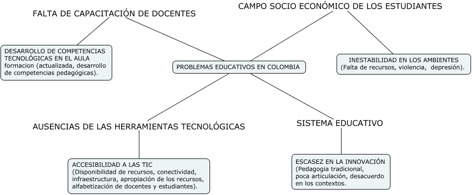 Este Cmap, tiene información relacionada con: PROBLEMAS EDUCATIVOS EN COLOMBIA, PROBLEMAS EDUCATIVOS EN COLOMBIA SISTEMA EDUCATIVO ESCASEZ EN LA INNOVACIÓN (Pedagogia tradicional, poca articulación, desacuerdo en los contextos., PROBLEMAS EDUCATIVOS EN COLOMBIA AUSENCIAS DE LAS HERRAMIENTAS TECNOLÓGICAS ACCESIBILIDAD A LAS TIC (Disponibilidad de recursos, conectividad, infraestructura, apropiación de los recursos, alfabetización de docentes y estudiantes)., PROBLEMAS EDUCATIVOS EN COLOMBIA FALTA DE CAPACITACIÓN DE DOCENTES DESARROLLO DE COMPETENCIAS TECNOLÓGICAS EN EL AULA formacion (actualizada, desarrollo de competencias pedagógicas)., PROBLEMAS EDUCATIVOS EN COLOMBIA CAMPO SOCIO ECONÓMICO DE LOS ESTUDIANTES INESTABILIDAD EN LOS AMBIENTES (Falta de recursos, violencia, depresión).