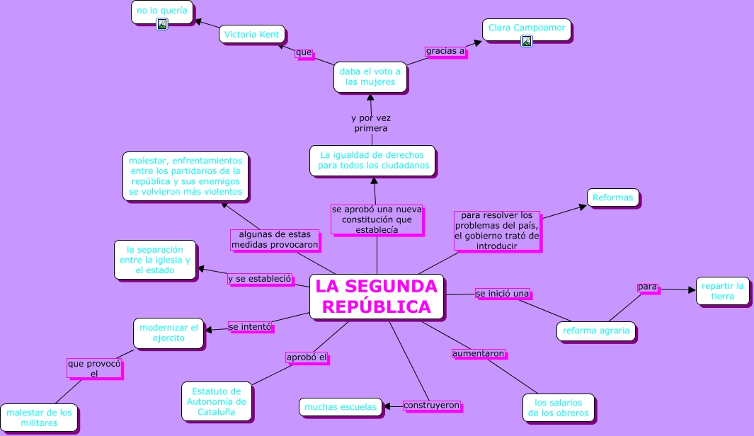 Este Cmap, tiene información relacionada con: La segunda república Rafa, Victoria Kent ???? no lo quería, LA SEGUNDA REPÚBLICA aprobó el Estatuto de Autonomía de Cataluña, daba el voto a las mujeres que Victoria Kent, daba el voto a las mujeres gracias a Clara Campoamor, LA SEGUNDA REPÚBLICA aumentaron los salarios de los obreros, LA SEGUNDA REPÚBLICA construyeron muchas escuelas, LA SEGUNDA REPÚBLICA se inició una reforma agraria, reforma agraria para repartir la tierra, LA SEGUNDA REPÚBLICA para resolver los problemas del país, el gobierno trató de introducir Reformas, LA SEGUNDA REPÚBLICA algunas de estas medidas provocaron malestar, enfrentamientos entre los partidarios de la república y sus enemigos se volvieron más violentos, La igualdad de derechos para todos los ciudadanos y por vez primera daba el voto a las mujeres, modernizar el ejercito que provocó el malestar de los militares, LA SEGUNDA REPÚBLICA se aprobó una nueva constitución que establecía La igualdad de derechos para todos los ciudadanos, LA SEGUNDA REPÚBLICA se intentó modernizar el ejercito, LA SEGUNDA REPÚBLICA y se estableció la separación entre la iglesia y el estado