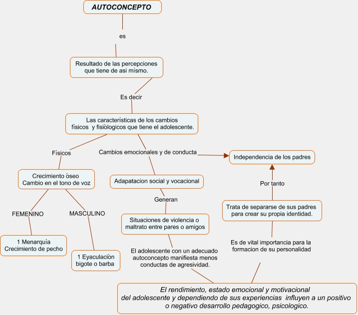 Este Cmap, tiene información relacionada con: mapa adolescencia autoestima y concepto, Crecimiento òseo Cambio en el tono de voz FEMENINO 1 Menarquìa Crecimiento de pecho, Trata de separarse de sus padres para crear su propia identidad. Por tanto Independencia de los padres, Resultado de las percepciones que tiene de asi mìsmo. Es decir Las caracterìsticas de los cambios fìsicos y fisiòlogicos que tiene el adolescente., Las caracterìsticas de los cambios fìsicos y fisiòlogicos que tiene el adolescente. Fìsicos Crecimiento òseo Cambio en el tono de voz, Situaciones de violencia o maltrato entre pares o amigos El adolescente con un adecuado autoconcepto manifiesta menos conductas de agresividad. El rendimiento, estado emocional y motivacional del adolescente y dependiendo de sus experiencias influyen a un positivo o negativo desarrollo pedagogico, psicologico., Las caracterìsticas de los cambios fìsicos y fisiòlogicos que tiene el adolescente. Cambios emocionales y de conducta Independencia de los padres, Trata de separarse de sus padres para crear su propia identidad. Es de vital importancia para la formacion de su personalidad El rendimiento, estado emocional y motivacional del adolescente y dependiendo de sus experiencias influyen a un positivo o negativo desarrollo pedagogico, psicologico., AUTOCONCEPTO es Resultado de las percepciones que tiene de asi mìsmo., Las caracterìsticas de los cambios fìsicos y fisiòlogicos que tiene el adolescente. Cambios emocionales y de conducta Adapatacion social y vocacional, Crecimiento òseo Cambio en el tono de voz MASCULINO 1 Eyaculaciòn bigote o barba, Adapatacion social y vocacional Generan Situaciones de violencia o maltrato entre pares o amigos