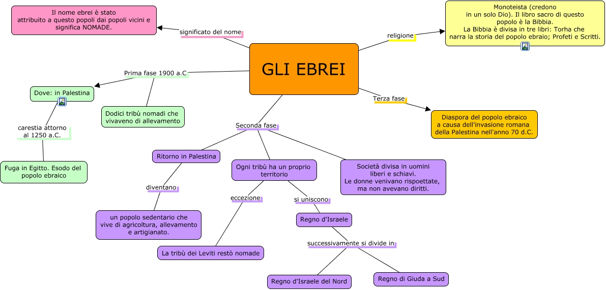 Questa Cmap, creata con IHMC CmapTools, contiene informazioni relative a: EBREI, GLI EBREI religione Monoteista (credono in un solo Dio). Il libro sacro di questo popolo è la Bibbia. La Bibbia è divisa in tre libri: Torha che narra la storia del popolo ebraio; Profeti e Scritti., Ogni tribù ha un proprio territorio si uniscono Regno d'Israele, GLI EBREI Seconda fase Ogni tribù ha un proprio territorio, GLI EBREI Seconda fase Società divisa in uomini liberi e schiavi. Le donne venivano rispoettate, ma non avevano diritti., GLI EBREI significato del nome Il nome ebrei è stato attribuito a questo popoli dai popoli vicini e significa NOMADE., GLI EBREI Seconda fase Ritorno in Palestina, GLI EBREI Prima fase 1900 a.C Dodici tribù nomadi che vivaveno di allevamento, Ritorno in Palestina diventano un popolo sedentario che vive di agricoltura, allevamento e artigianato., Dove: in Palestina carestia attorno al 1250 a.C. Fuga in Egitto. Esodo del popolo ebraico, Regno d'Israele successivamente si divide in Regno d'Israele del Nord, GLI EBREI Prima fase 1900 a.C Dove: in Palestina, Regno d'Israele successivamente si divide in Regno di Giuda a Sud, Ogni tribù ha un proprio territorio eccezione La tribù dei Leviti restò nomade, GLI EBREI Terza fase Diaspora del popolo ebraico a causa dell'invasione romana della Palestina nell'anno 70 d.C.