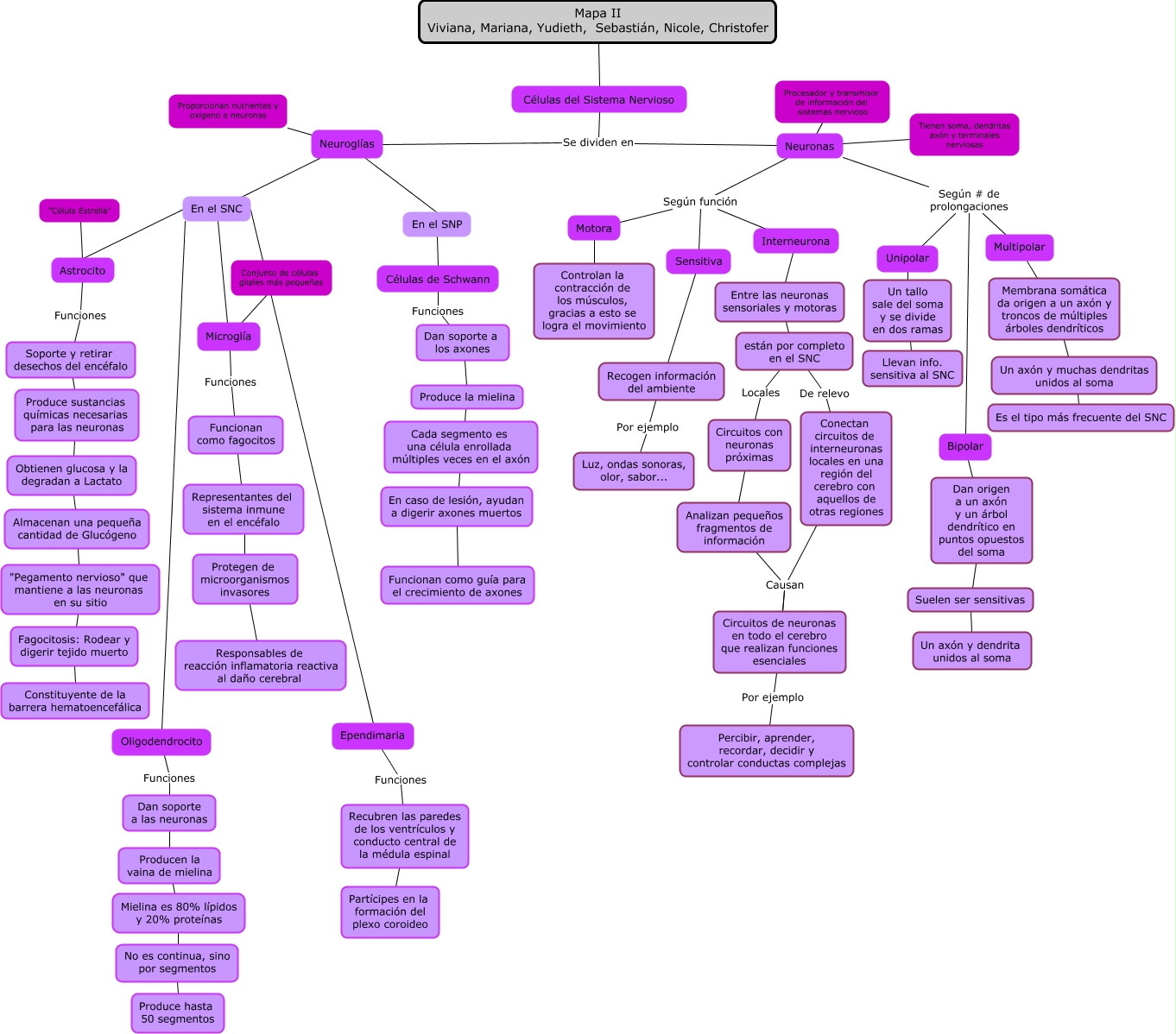 Este Cmap, tiene información relacionada con: Mapa capítulo 2- bases I, Neuroglías Proporcionan nutrientes y oxígeno a neuronas, Neuronas Según función Interneurona, Analizan pequeños fragmentos de información Causan Circuitos de neuronas en todo el cerebro que realizan funciones esenciales, Dan origen a un axón y un árbol dendrítico en puntos opuestos del soma Suelen ser sensitivas, Bipolar Dan origen a un axón y un árbol dendrítico en puntos opuestos del soma, Células de Schwann Funciones Dan soporte a los axones, Dan soporte a los axones Produce la mielina, Neuronas Según función Motora, Conectan circuitos de interneuronas locales en una región del cerebro con aquellos de otras regiones Causan Circuitos de neuronas en todo el cerebro que realizan funciones esenciales, Neuronas Según # de prolongaciones Bipolar, Dan soporte a las neuronas Producen la vaina de mielina, Procesador y transmisor de información del sistemas nervioso Neuronas, están por completo en el SNC De relevo Conectan circuitos de interneuronas locales en una región del cerebro con aquellos de otras regiones, Produce la mielina Cada segmento es una célula enrollada múltiples veces en el axón, Neuronas Según # de prolongaciones Multipolar, Astrocito "Célula Estrella", Neuroglías En el SNP, Circuitos con neuronas próximas Analizan pequeños fragmentos de información, Soporte y retirar desechos del encéfalo Produce sustancias químicas necesarias para las neuronas, Circuitos de neuronas en todo el cerebro que realizan funciones esenciales Por ejemplo Percibir, aprender, recordar, decidir y controlar conductas complejas