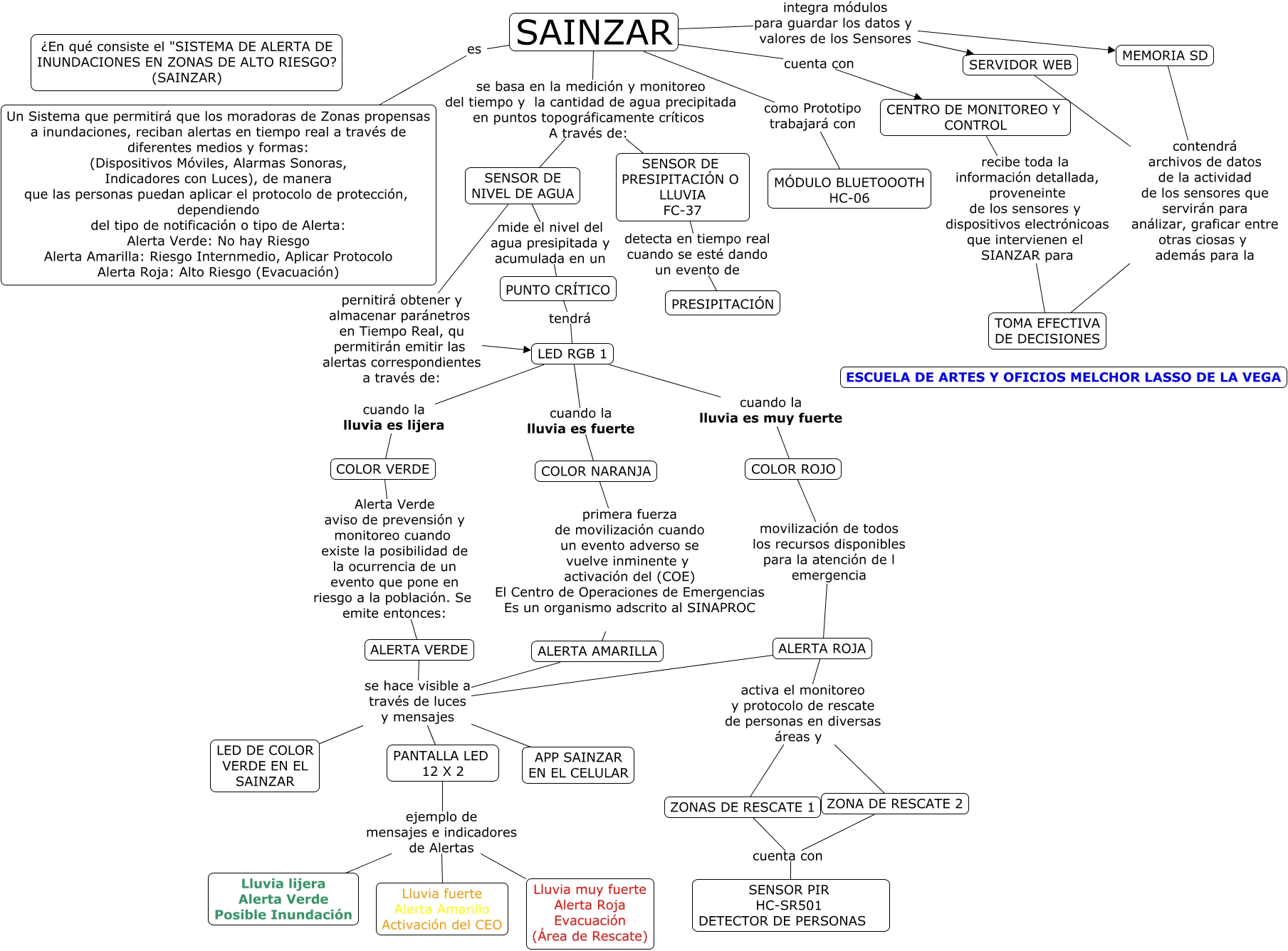 Este Cmap, tiene información relacionada con: SAINZAR, PANTALLA LED 12 X 2 ejemplo de mensajes e indicadores de Alertas Lluvia lijera Alerta Verde Posible Inundación, SAINZAR es Un Sistema que permitirá que los moradoras de Zonas propensas a inundaciones, reciban alertas en tiempo real a través de diferentes medios y formas: (Dispositivos Móviles, Alarmas Sonoras, Indicadores con Luces), de manera que las personas puedan aplicar el protocolo de protección, dependiendo del tipo de notificación o tipo de Alerta: Alerta Verde: No hay Riesgo Alerta Amarilla: Riesgo Internmedio, Aplicar Protocolo Alerta Roja: Alto Riesgo (Evacuación), CENTRO DE MONITOREO Y CONTROL recibe toda la información detallada, proveneinte de los sensores y dispositivos electrónicoas que intervienen el SIANZAR para TOMA EFECTIVA DE DECISIONES, LED RGB 1 cuando la lluvia es muy fuerte COLOR ROJO, SAINZAR como Prototipo trabajará con MÓDULO BLUETOOOTH HC-06, COLOR NARANJA primera fuerza de movilización cuando un evento adverso se vuelve inminente y activación del (COE) El Centro de Operaciones de Emergencias Es un organismo adscrito al SINAPROC ALERTA AMARILLA, ZONA DE RESCATE 2 cuenta con SENSOR PIR HC-SR501 DETECTOR DE PERSONAS, SENSOR DE NIVEL DE AGUA mide el nivel del agua presipitada y acumulada en un PUNTO CRÍTICO, ALERTA AMARILLA se hace visible a través de luces y mensajes LED DE COLOR VERDE EN EL SAINZAR, ALERTA ROJA activa el monitoreo y protocolo de rescate de personas en diversas áreas y ZONA DE RESCATE 2, LED RGB 1 cuando la lluvia es fuerte COLOR NARANJA, SAINZAR integra módulos para guardar los datos y valores de los Sensores MEMORIA SD, COLOR ROJO movilización de todos los recursos disponibles para la atención de l emergencia ALERTA ROJA, ALERTA VERDE se hace visible a través de luces y mensajes PANTALLA LED 12 X 2, SAINZAR cuenta con CENTRO DE MONITOREO Y CONTROL, ALERTA ROJA se hace visible a través de luces y mensajes APP SAINZAR EN EL CELULAR, COLOR VERDE Alerta Verde aviso de prevensión y monitoreo cuando existe la posibilidad de la ocurrencia de un evento que pone en riesgo a la población. Se emite entonces: ALERTA VERDE, SAINZAR se basa en la medición y monitoreo del tiempo y la cantidad de agua precipitada en puntos topográficamente críticos A través de: SENSOR DE PRESIPITACIÓN O LLUVIA FC-37, ALERTA VERDE se hace visible a través de luces y mensajes LED DE COLOR VERDE EN EL SAINZAR, SAINZAR integra módulos para guardar los datos y valores de los Sensores SERVIDOR WEB