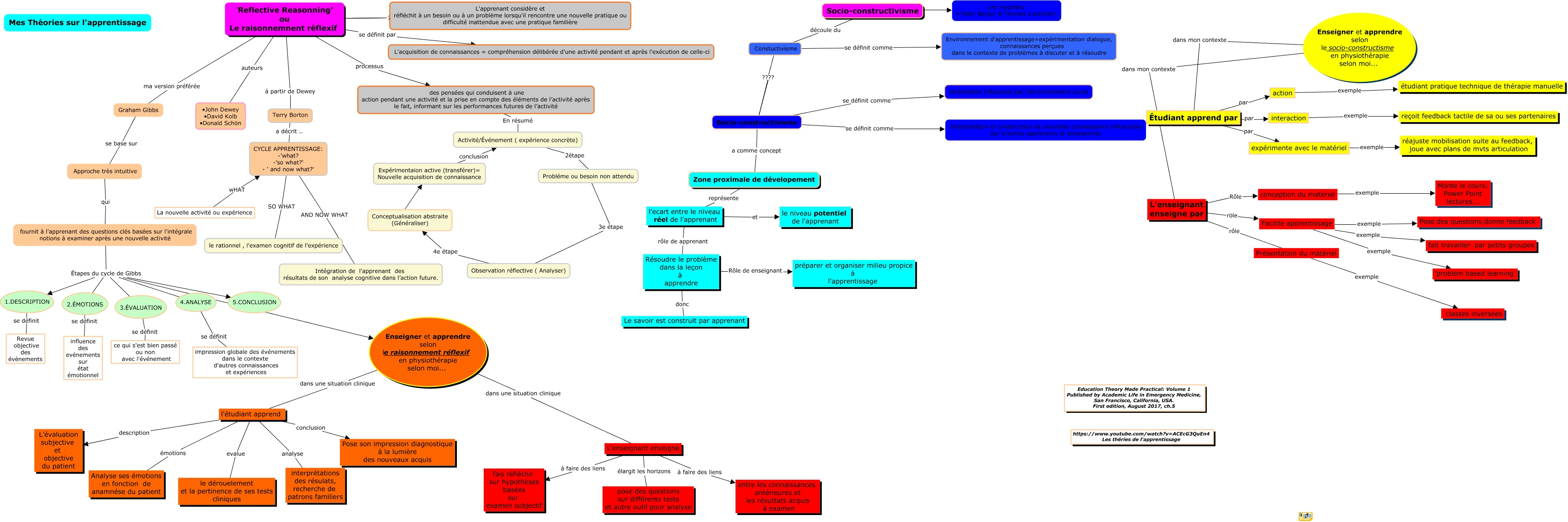 This Concept Map, created with IHMC CmapTools, has information related to: theories SPGaudencio, 1.DESCRIPTION se définit Revue objective des évènements, Enseigner et apprendre selon le raisonnement réflexif en physiothérapie selon moi... dans une situation clinique L'enseignant enseigne, L'enseignant enseigne par röle Facilite apprentissage, Terry Borton a décrit .. CYCLE APPRENTISSAGE: -'what? -'so what?' - ' and now what?', expérimente avec le matériel exemple réajuste mobilisation suite au feedback, joue avec plans de mvts articulation, l'étudiant apprend description L'évaluation subjective et objective du patient, Constuctivisme se définit comme Environnement d'apprentissage=expérimentation dialogue, connaissances perçues dans le contexte de problèmes à discuter et à résoudre, 'Reflective Reasonning' ou Le raisonnemnent réflexif processus des pensées qui conduisent à une action pendant une activité et la prise en compte des éléments de l’activité après le fait, informant sur les performances futures de l’activité, conception du matériel exemple Monte le cours: Power Point lectures..., 'Reflective Reasonning' ou Le raisonnemnent réflexif ma version préférée Graham Gibbs, Résoudre le problème dans la leçon à apprendre Rôle de enseignant préparer et organiser milieu propice à l'apprentissage, L'enseignant enseigne à faire des liens fais réfléchir sur hypothèses basées sur examen subjectif, Expérimentaion active (transférer)= Nouvelle acquisition de connaissance conclusion Activité/Événement ( expérience concrète), Facilite apprentissage exemple Pose des questions,donne feedback, fournit à l'apprenant des questions clés basées sur l'intégrale notions à examiner après une nouvelle activité Étapes du cycle de Gibbs 3.ÉVALUATION, fournit à l'apprenant des questions clés basées sur l'intégrale notions à examiner après une nouvelle activité Étapes du cycle de Gibbs Enseigner et apprendre selon le raisonnement réflexif en physiothérapie selon moi..., l'ecart entre le niveau réel de l'apprenant et le niveau potentiel de l'apprenant, Activité/Événement ( expérience concrète) 2étape Probléme ou besoin non attendu, Observation réflective ( Analyser) 4e étape Conceptualisation abstraite (Généraliser), des pensées qui conduisent à une action pendant une activité et la prise en compte des éléments de l’activité après le fait, informant sur les performances futures de l’activité En résumé Activité/Événement ( expérience concrète)