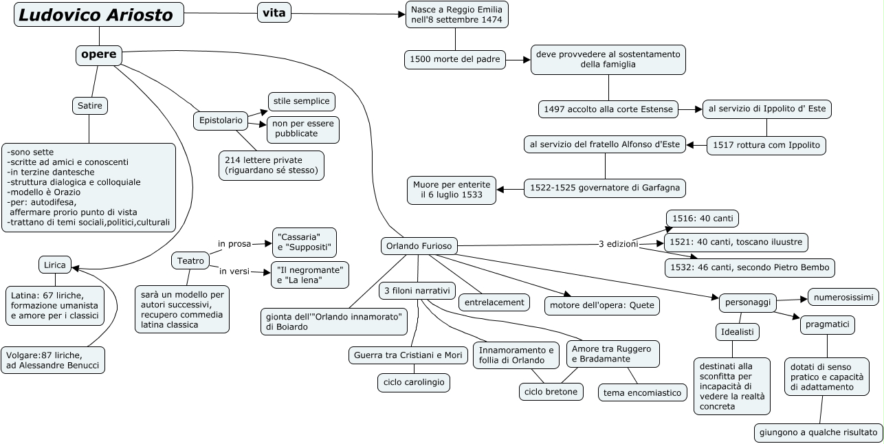 Questa Cmap, creata con IHMC CmapTools, contiene informazioni relative a: Ariosto vita e opera, Teatro in versi "Il negromante" e "La lena", Amore tra Ruggero e Bradamante ???? ciclo bretone, opere ???? Epistolario, Epistolario ???? 214 lettere private (riguardano sé stesso), Orlando Furioso ???? 3 filoni narrativi, opere ???? Satire, Teatro in prosa "Cassaria" e "Suppositi", Ludovico Ariosto vita Nasce a Reggio Emilia nell'8 settembre 1474, Orlando Furioso 3 edizioni 1532: 46 canti, secondo Pietro Bembo, personaggi ???? pragmatici, opere ???? Orlando Furioso, Orlando Furioso 3 edizioni 1521: 40 canti, toscano iluustre, 1497 accolto alla corte Estense ???? al servizio di Ippolito d' Este, 3 filoni narrativi ???? Innamoramento e follia di Orlando, Teatro ???? sarà un modello per autori successivi, recupero commedia latina classica, Lirica ???? Volgare:87 liriche, ad Alessandre Benucci, Guerra tra Cristiani e Mori ???? ciclo carolingio, al servizio del fratello Alfonso d'Este ???? 1522-1525 governatore di Garfagna, Innamoramento e follia di Orlando ???? ciclo bretone, personaggi ???? Idealisti