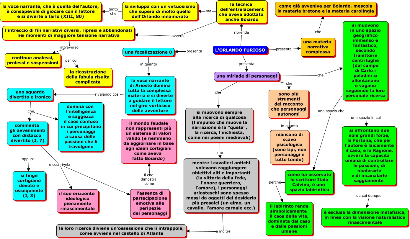 Questa Cmap, creata con IHMC CmapTools, contiene informazioni relative a: Orlando Furioso in breve, L'ORLANDO FURIOSO presenta una miriade di personaggi, commenta gli avvenimenti con distacco divertito (I, 7) oppure si finge cortigiano devoto e ossequiente (I, 3), una miriade di personaggi che si muovono sempre alla ricerca di qualcosa (l'impulso che muove la narrazione è la "quete", la ricerca, l'inchiesta, come nei poemi medievali), L'ORLANDO FURIOSO presenta una materia narrativa complessa, uno sguardo divertito e ironico che commenta gli avvenimenti con distacco divertito (I, 7), come ha osservato lo scrittore Italo Calvino, è uno spazio labirintico perché il labirinto rende simbolicamente il caos della vita, dominata dal caso e dalle passioni umane, l'assenza di partecipazione emotiva alle peripezie dei personaggi il che dimostra come il mondo feudale non rappresenti più un sistema di valori valido (e nemmeno da aggiornare in base agli ideali cortigiani come aveva fatto Boiardo), l'intreccio di fili narrativi diversi, ripresi e abbandonati nei momenti di maggiore tensione narrativa attraverso continue analessi, prolessi e sospensioni, la tecnica dell'entrelacement che aveva adottato anche Boiardo ma la sviluppa con un virtuosismo che supera di molto quello dell'Orlando innamorato, continue analessi, prolessi e sospensioni per cui la ricostruzione della fabula risulta complicata, una materia narrativa complessa che come già avveniva per Boiardo, mescola la materia bretone e la materia carolingia, si affrontano due sole grandi forze, la Fortuna, che per l'autore è laicamente il caso, e la Ragione, ovvero la capacità umana di controllare le passioni, di moderarle e di incanalarle saggiamente da cui dunque è esclusa la dimensione metafisica, in linea con la visione naturalistica rinascimentale, si muovono sempre alla ricerca di qualcosa (l'impulso che muove la narrazione è la "quete", la ricerca, l'inchiesta, come nei poemi medievali) ma mentre i cavalieri antichi volevano raggiungere obiettivi alti e importanti (la vittoria della fede, l'onore guerriero, l'amore), i personaggi ariosteschi sono spesso mossi da oggetti del desiderio più prosaici (un elmo, un cavallo, l'amore carnale ecc.), la tecnica dell'entrelacement che aveva adottato anche Boiardo ovvero l'intreccio di fili narrativi diversi, ripresi e abbandonati nei momenti di maggiore tensione narrativa, commenta gli avvenimenti con distacco divertito (I, 7) e così rivela il suo orizzonte ideologico pienamente rinascimentale, commenta gli avvenimenti con distacco divertito (I, 7) e così rivela l'assenza di partecipazione emotiva alle peripezie dei personaggi, una miriade di personaggi che sono più strumenti del racconto che personaggi autonomi, una focalizzazione 0 in quanto la voce narrante di Ariosto domina tutta la complessa materia e si diverte a guidare il lettore nel giro vorticoso delle avventure, la voce narrante di Ariosto domina tutta la complessa materia e si diverte a guidare il lettore nel giro vorticoso delle avventure rivelando così uno sguardo divertito e ironico, si muovono in uno spazio geografico immenso e fantastico, secondo traiettorie centrifughe (dal campo di Carlo i paladini si allontanano e vagano seguendo la loro personale ricerca uno spazio che come ha osservato lo scrittore Italo Calvino, è uno spazio labirintico