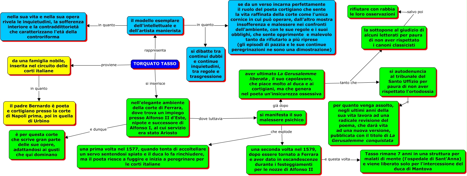 Questa Cmap, creata con IHMC CmapTools, contiene informazioni relative a: Torquato Tasso, TORQUATO TASSO si inserisce nell'elegante ambiente della corte di Ferrara, dove trova un impiego presso Alfonso II d'Este, nipote e successore di Alfonso I, al cui servizio era stato Ariosto, aver ultimato La Gerusalemme liberata, il suo capolavoro, che piace molto al duca e ai cortigiani, ma che genera nel poeta un'insicurezza ossessiva tanto che si autodenuncia al tribunale del Santo Uffizio per paura di non aver rispettato l'ortodossia, nell'elegante ambiente della corte di Ferrara, dove trova un impiego presso Alfonso II d'Este, nipote e successore di Alfonso I, al cui servizio era stato Ariosto dove tuttavia si manifesta il suo malessere psichico, TORQUATO TASSO rappresenta il modello esemplare dell'intellettuale e dell'artista manierista, da una famiglia nobile, inserita nel circuito delle corti italiane in quanto il padre Bernardo è poeta e cortigiano presso la corte di Napoli prima, poi in quella di Urbino, il modello esemplare dell'intellettuale e dell'artista manierista in quanto nella sua vita e nella sua opera rivela le inquietudini, la sofferenza interiore e la contraddittorietà che caratterizzano l'età della controriforma, si autodenuncia al tribunale del Santo Uffizio per paura di non aver rispettato l'ortodossia e per quanto venga assolto, negli ultimi anni della sua vita lavora ad una radicale revisione del poema, che darà vita ad una nuova versione, pubblicata con il titolo di La Gerusalemme conquistata, si manifesta il suo malessere psichico già dopo aver ultimato La Gerusalemme liberata, il suo capolavoro, che piace molto al duca e ai cortigiani, ma che genera nel poeta un'insicurezza ossessiva, nell'elegante ambiente della corte di Ferrara, dove trova un impiego presso Alfonso II d'Este, nipote e successore di Alfonso I, al cui servizio era stato Ariosto e dunque è per questa corte che scrive gran parte delle sue opere, adattandosi ai gusti che qui dominano, TORQUATO TASSO proviene da una famiglia nobile, inserita nel circuito delle corti italiane, il modello esemplare dell'intellettuale e dell'artista manierista in quanto se da un verso incarna perfettamente il ruolo del poeta cortigiano che sente la vita raffinata della corte come l'unica cornice in cui può operare, dall'altro mostra insofferenza e malessere nei confronti dell'ambiente, con le sue regole e i suoi obblighi, che sente opprimente e malevolo tanto da rifiutarlo a più riprese (gli episodi di pazzia e le sue continue peregrinazioni ne sono una dimostrazione), il modello esemplare dell'intellettuale e dell'artista manierista in quanto si dibatte tra continui dubbi e continue inquietudini, tra regole e trasgressione, aver ultimato La Gerusalemme liberata, il suo capolavoro, che piace molto al duca e ai cortigiani, ma che genera nel poeta un'insicurezza ossessiva tanto che la sottopone al giudizio di alcuni letterati per paura di non aver rispettato i canoni classicisti, la sottopone al giudizio di alcuni letterati per paura di non aver rispettato i canoni classicisti salvo poi rifiutare con rabbia le loro osservazioni, si manifesta il suo malessere psichico che esplode una seconda volta nel 1579, dopo essere tornato a Ferrara e aver dato in escandescenze durante i festeggiamenti per le nozze di Alfonso II, una seconda volta nel 1579, dopo essere tornato a Ferrara e aver dato in escandescenze durante i festeggiamenti per le nozze di Alfonso II e questa volta Tasso rimane 7 anni in una struttura per malati di mente (l'ospedale di Sant'Anna) e viene liberato solo per l'intercessione del duca di Mantova, si manifesta il suo malessere psichico che esplode una prima volta nel 1577, quando tenta di accoltellare un servo sentendosi spiato e il duca lo fa rinchiudere, ma il poeta riesce a fuggire e inizia a peregrinare per le corti italiane