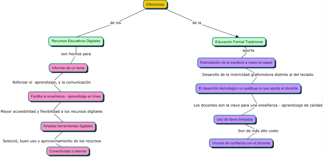 Este Cmap, tiene información relacionada con: RED vs Educación Formal Tradicional, Informar de un tema Reforzar el aprendizaje, y la comunicación Facilita la enseñanza - aprendizaje en línea, Estimulación de la escritura a mano en papel Desarollo de la motricidad grafomotora distinta al del teclado El desarrollo tecnológico no sustituye lo que aporta el docente, Educación Formal Tradicional aporta Estimulación de la escritura a mano en papel, Diferencias de los Recursos Educativos Digitales, El desarrollo tecnológico no sustituye lo que aporta el docente Los docentes son la clave para una enseñanza - aprendizaje de calidad Uso de libros limitados, Uso de libros limitados Son de más alto costo Vínculo de confianza con el docente, Amplias herramientas digitales Selecció, buen uso y aprovechamiento de los recursos Conectividad a internet, Diferencias de la Educación Formal Tradicional, Recursos Educativos Digitales son hechos para Informar de un tema, Facilita la enseñanza - aprendizaje en línea Mayor accesibilidad y flexibilidad a los recursos digitales Amplias herramientas digitales