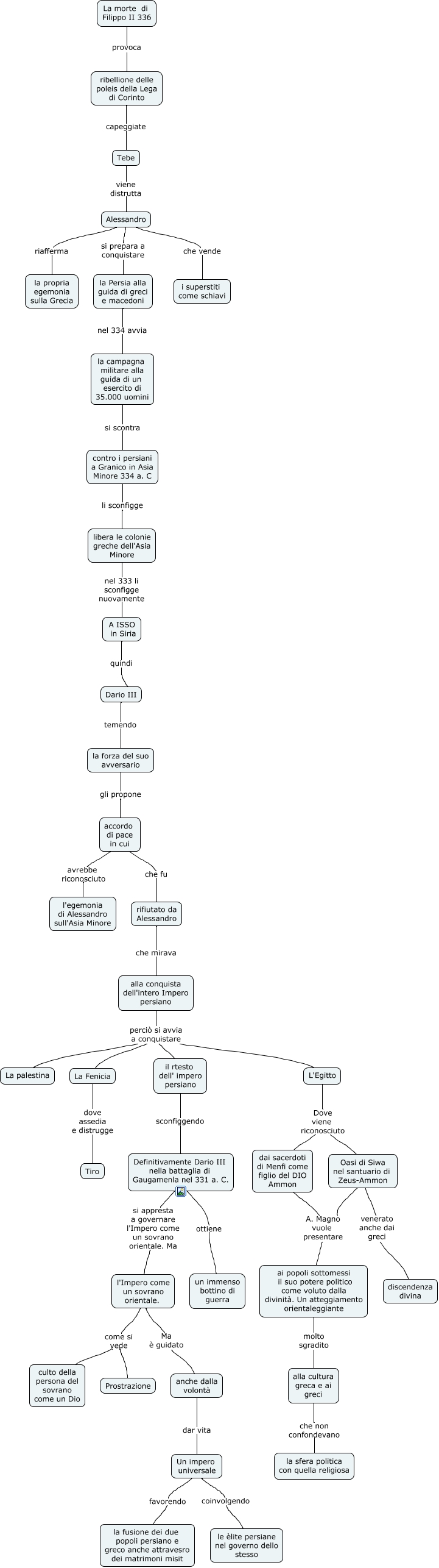 Questa Cmap, creata con IHMC CmapTools, contiene informazioni relative a: Alessandro Magno, ribellione delle poleis della Lega di Corinto capeggiate Tebe, l'Impero come un sovrano orientale. come si vede Prostrazione, accordo di pace in cui che fu rifiutato da Alessandro, la forza del suo avversario gli propone accordo di pace in cui, libera le colonie greche dell'Asia Minore nel 333 li sconfigge nuovamente A ISSO in Siria, Alessandro che vende i superstiti come schiavi, Tebe viene distrutta Alessandro, Alessandro si prepara a conquistare la Persia alla guida di greci e macedoni, A ISSO in Siria quindi Dario III, Oasi di Siwa nel santuario di Zeus-Ammon venerato anche dai greci discendenza divina, Definitivamente Dario III nella battaglia di Gaugamenla nel 331 a. C. si appresta a governare l'Impero come un sovrano orientale. Ma l'Impero come un sovrano orientale., L'Egitto Dove viene riconosciuto Oasi di Siwa nel santuario di Zeus-Ammon, il rtesto dell' impero persiano sconfiggendo Definitivamente Dario III nella battaglia di Gaugamenla nel 331 a. C., Definitivamente Dario III nella battaglia di Gaugamenla nel 331 a. C. ottiene un immenso bottino di guerra, Oasi di Siwa nel santuario di Zeus-Ammon A. Magno vuole presentare ai popoli sottomessi il suo potere politico come voluto dalla divinità. Un atteggiamento orientaleggiante, alla conquista dell'intero Impero persiano perciò si avvia a conquistare La Fenicia, La Fenicia dove assedia e distrugge Tiro, l'Impero come un sovrano orientale. come si vede culto della persona del sovrano come un Dio, alla cultura greca e ai greci che non confondevano la sfera politica con quella religiosa, alla conquista dell'intero Impero persiano perciò si avvia a conquistare L'Egitto