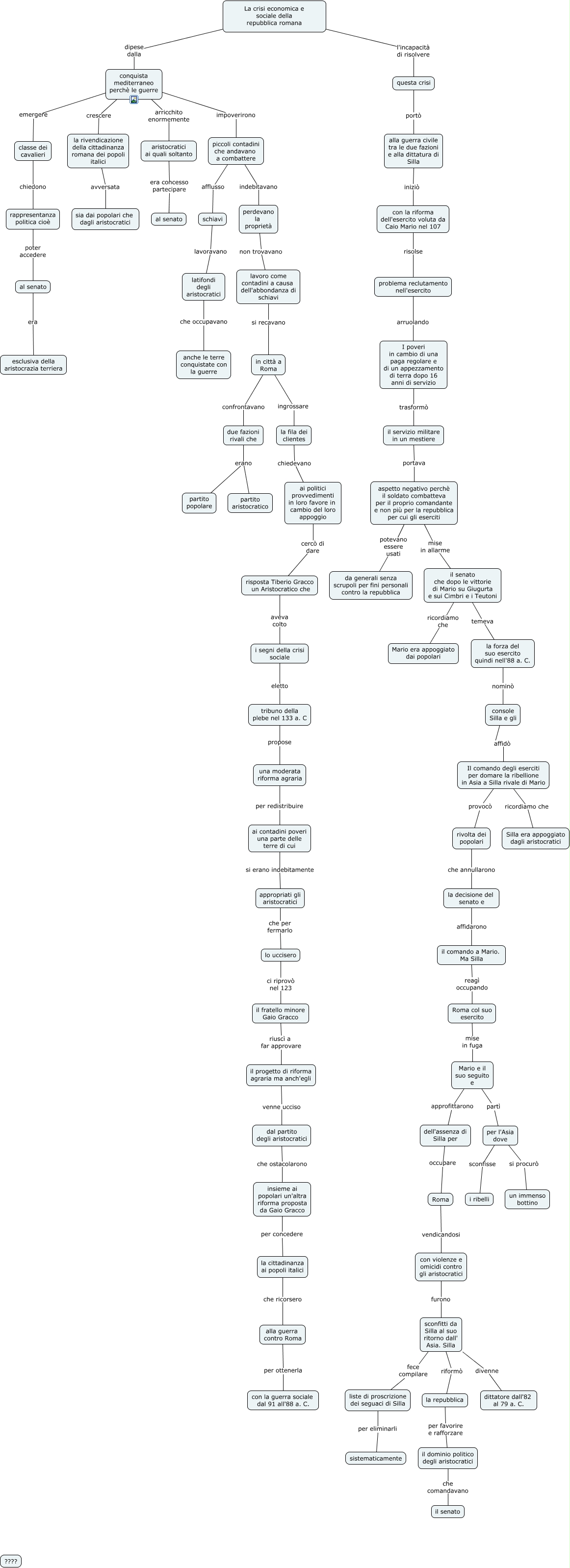 Questa Cmap, creata con IHMC CmapTools, contiene informazioni relative a: la crisi della repubblica romana, latifondi degli aristocratici che occupavano anche le terre conquistate con la guerre, lo uccisero ci riprovò nel 123 il fratello minore Gaio Gracco, Mario e il suo seguito e approfittarono dell'assenza di Silla per, i segni della crisi sociale eletto tribuno della plebe nel 133 a. C, una moderata riforma agraria per redistribuire ai contadini poveri una parte delle terre di cui, Roma col suo esercito mise in fuga Mario e il suo seguito e, aspetto negativo perchè il soldato combatteva per il proprio comandante e non più per la repubblica per cui gli eserciti potevano essere usati da generali senza scrupoli per fini personali contro la repubblica, aspetto negativo perchè il soldato combatteva per il proprio comandante e non più per la repubblica per cui gli eserciti mise in allarme il senato che dopo le vittorie di Mario su Giugurta e sui Cimbri e i Teutoni, con violenze e omicidi contro gli aristocratici furono sconfitti da Silla al suo ritorno dall' Asia. Silla, la repubblica per favorire e rafforzare il dominio politico degli aristocratici, dal partito degli aristocratici che ostacolarono insieme ai popolari un'altra riforma proposta da Gaio Gracco, due fazioni rivali che erano partito popolare, la rivendicazione della cittadinanza romana dei popoli italici avversata sia dai popolari che dagli aristocratici, il servizio militare in un mestiere portava aspetto negativo perchè il soldato combatteva per il proprio comandante e non più per la repubblica per cui gli eserciti, il senato che dopo le vittorie di Mario su Giugurta e sui Cimbri e i Teutoni ricordiamo che Mario era appoggiato dai popolari, il fratello minore Gaio Gracco riuscì a far approvare il progetto di riforma agraria ma anch'egli, tribuno della plebe nel 133 a. C propose una moderata riforma agraria, al senato era esclusiva della aristocrazia terriera, insieme ai popolari un'altra riforma proposta da Gaio Gracco per concedere la cittadinanza ai popoli italici, con la riforma dell'esercito voluta da Caio Mario nel 107 risolse problema reclutamento nell'esercito