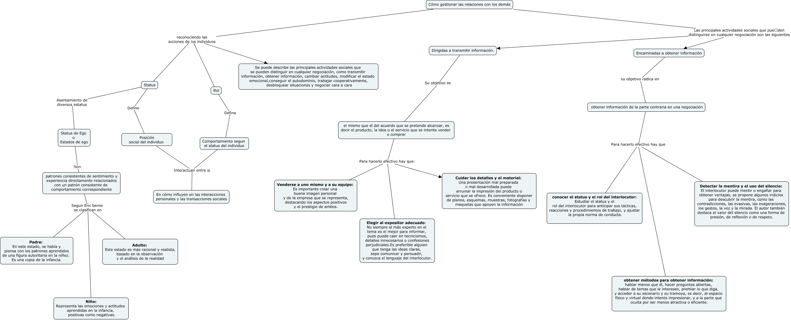 Este Cmap, tiene información relacionada con: Tecnicas de negoviavion, Status Define Posición social del individuo, obtener información de la parte contraria en una negociación Para hacerlo efectivo hay que Detectar la mentira y el uso del silencio: El interlocutor puede mentir o engañar para obtener ventajas, se propone algunos indicios para descubrir la mentira, como las contradicciones, las evasivas, las exageraciones, los gestos, la voz y la mirada. El autor también destaca el valor del silencio como una forma de presión, de reflexión o de respeto., Status Asentamiento de diversos estatus Status de Ego o Estados de ego, Dirigidas a transmitir información. Su objetivo es el mismo que el del acuerdo que se pretende alcanzar, es decir el producto, la idea o el servicio que se intenta vender o comprar, obtener información de la parte contraria en una negociación Para hacerlo efectivo hay que obtener métodos para obtener información: hablar menos que él, hacer preguntas abiertas, hablar de temas que le interesen, premiar lo que diga, y acceder a su escenario y su tramoya, es decir, al espacio físico y virtual donde intenta impresionar, y a la parte que oculta por ser menos atractiva o eficiente., Cómo gestionar las relaciones con los demás Las principales actividades sociales que pueden distinguirse en cualquier negociación son las siguientes Encaminadas a obtener información, patrones consistentes de sentimiento y experiencia directamente relacionados con un patrón consistente de comportamiento correspondiente Segun Eric berne se clasifican en Niño: Representa las emociones y actitudes aprendidas en la infancia, positivas como negativas., Cómo gestionar las relaciones con los demás reconociendo las acciones de los individuos Se puede describe las principales actividades sociales que se pueden distinguir en cualquier negociación, como transmitir información, obtener información, cambiar actitudes, modificar el estado emocional,conseguir el autodominio, trabajar cooperativamente, desbloquear situaciones y negociar cara a cara, Status de Ego o Estados de ego Son patrones consistentes de sentimiento y experiencia directamente relacionados con un patrón consistente de comportamiento correspondiente, patrones consistentes de sentimiento y experiencia directamente relacionados con un patrón consistente de comportamiento correspondiente Segun Eric berne se clasifican en Adulto: Este estado es más racional y realista, basado en la observación y el análisis de la realidad, Comportamiento segun el status del individuo Interactuan entre si En cómo influyen en las interacciones personales y las transacciones sociales, Posición social del individuo Interactuan entre si En cómo influyen en las interacciones personales y las transacciones sociales, el mismo que el del acuerdo que se pretende alcanzar, es decir el producto, la idea o el servicio que se intenta vender o comprar Para hacerlo efectivo hay que: Cuidar los detalles y el material: Una presentación mal preparada o mal desarrollada puede arruinar la impresión del producto o servicio que se ofrece. Es conveniente disponer de planos, esquemas, muestras, fotografías y maquetas que apoyen la información, el mismo que el del acuerdo que se pretende alcanzar, es decir el producto, la idea o el servicio que se intenta vender o comprar Para hacerlo efectivo hay que: Venderse a uno mismo y a su equipo: Es importante crear una buena imagen personal y de la empresa que se representa, destacando los aspectos positivos y el prestigio de ambos., Encaminadas a obtener información su objetivo radica en obtener información de la parte contraria en una negociación, Cómo gestionar las relaciones con los demás Las principales actividades sociales que pueden distinguirse en cualquier negociación son las siguientes Dirigidas a transmitir información., Cómo gestionar las relaciones con los demás reconociendo las acciones de los individuos Rol, Cómo gestionar las relaciones con los demás reconociendo las acciones de los individuos Status, obtener información de la parte contraria en una negociación Para hacerlo efectivo hay que conocer el status y el rol del interlocutor: Estudiar el status y el rol del interlocutor para anticipar sus tácticas, reacciones y procedimientos de trabajo, y ajustar la propia norma de conducta., patrones consistentes de sentimiento y experiencia directamente relacionados con un patrón consistente de comportamiento correspondiente Segun Eric berne se clasifican en Padre: En este estado, se habla y piensa con los patrones aprendidos de una figura autoritaria en la niñez. Es una copia de la infancia.
